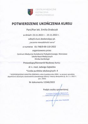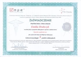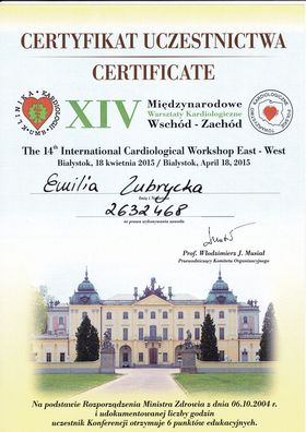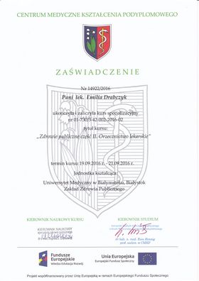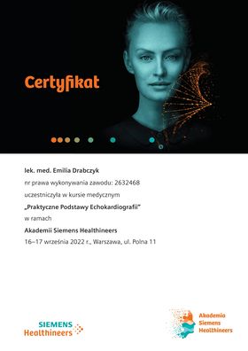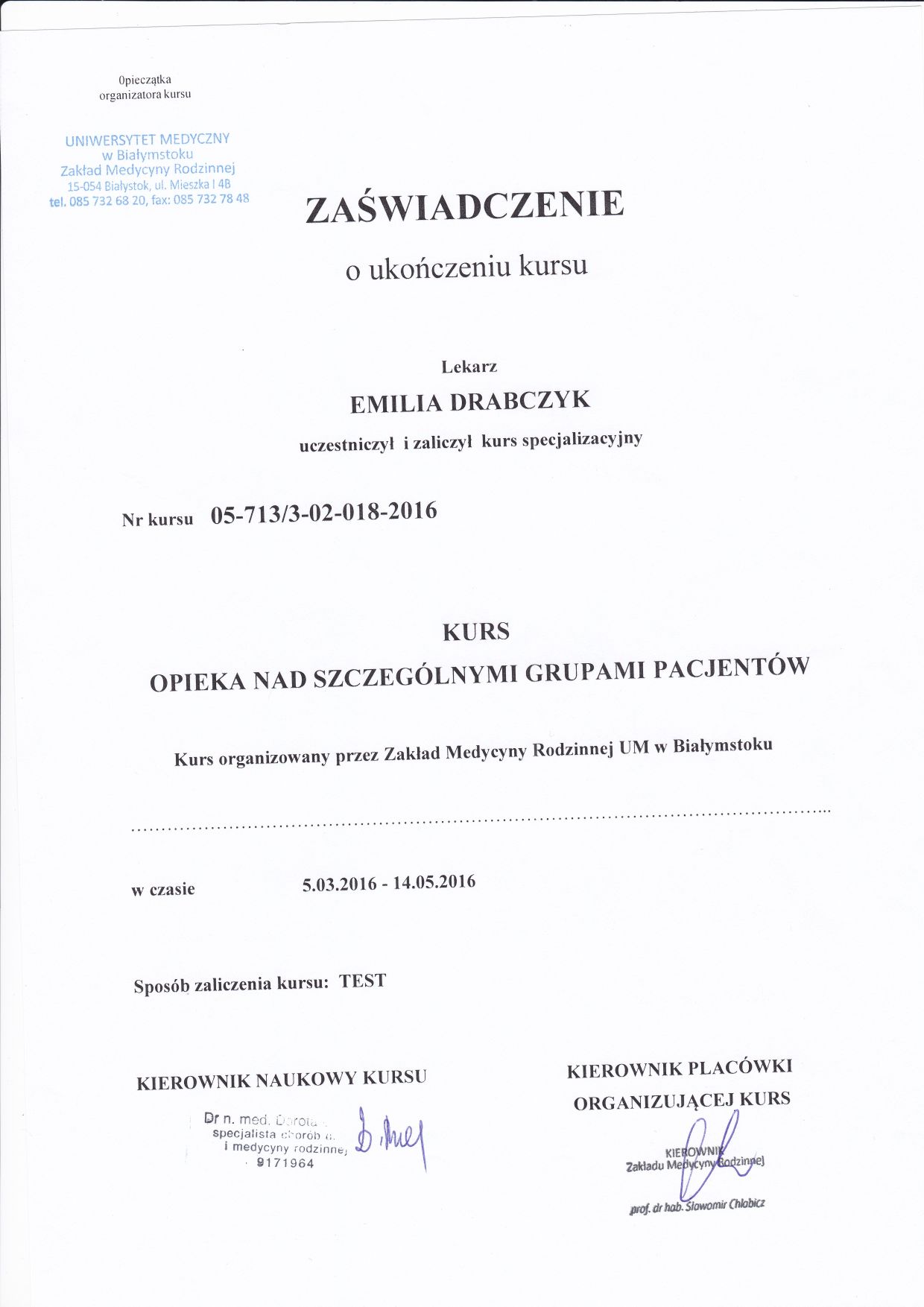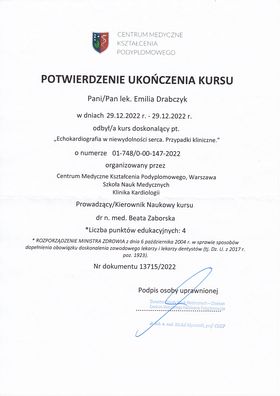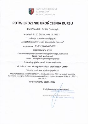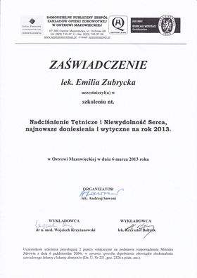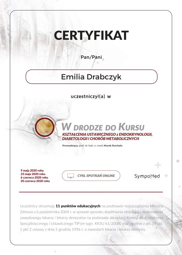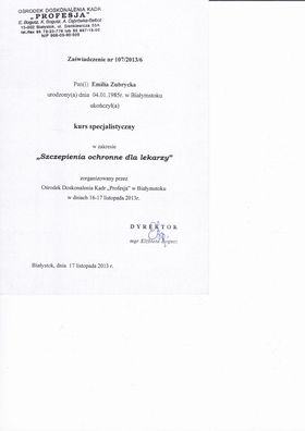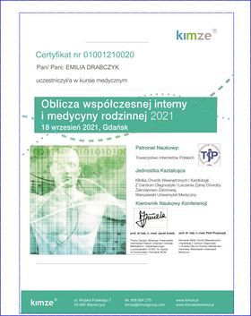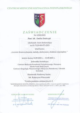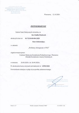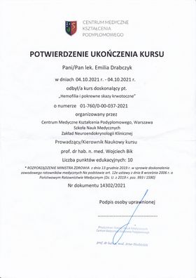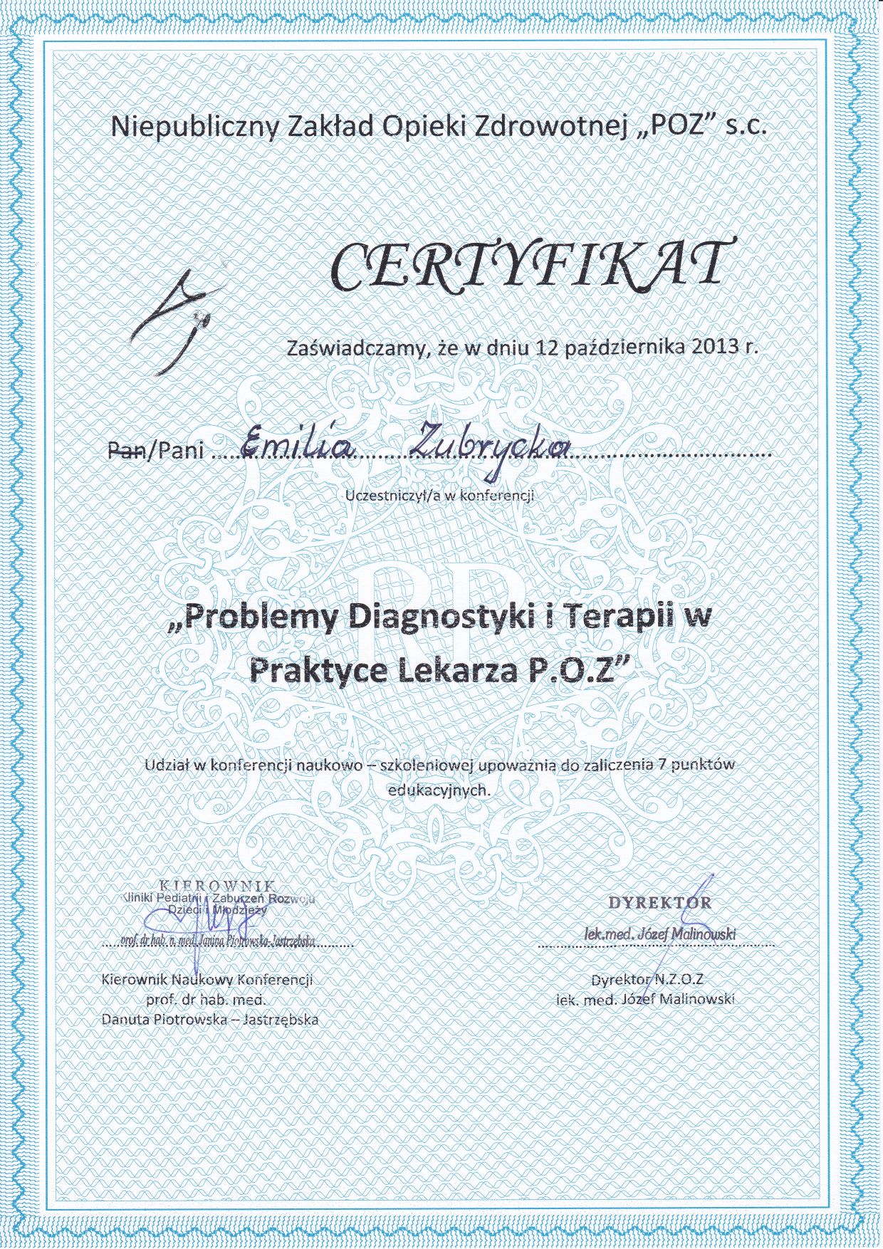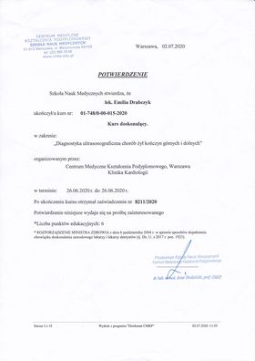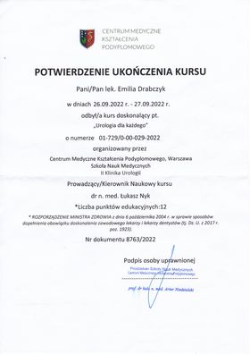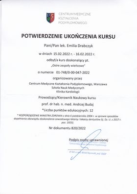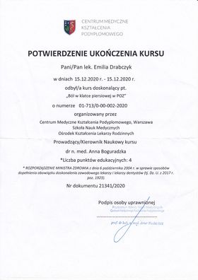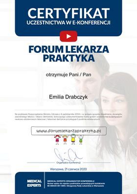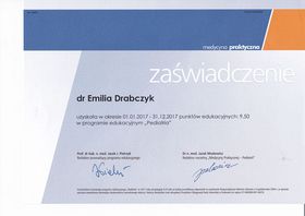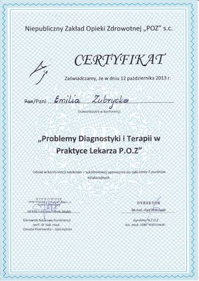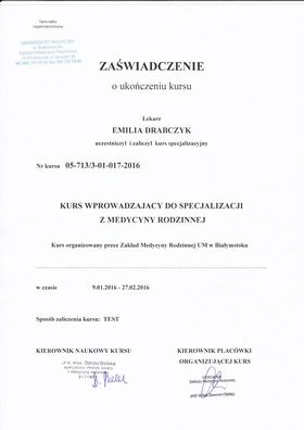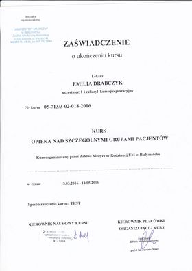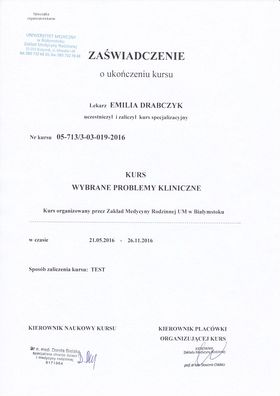 Medycyna uczy pokory, dlatego regularnie podnoszę swoje kwalifikacje uczestnicząc w wykładach, kursach, konferencjach i szkoleniach. Aby zapewnić najwyższe bezpieczeństwo swoim pacjentom oraz leczenie na wysokim poziomie, cały czas podnoszę swoje kompetencje i umiejętności zawodowe, często wykraczając poza ramy medycyny rodzinnej. Poniżej znajduje się galeria z certyfikatami z niektórych kursów.