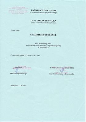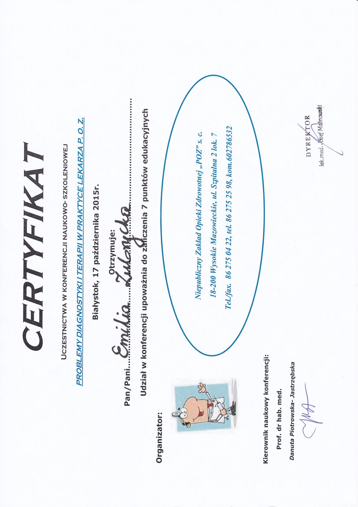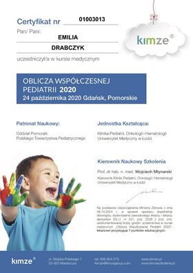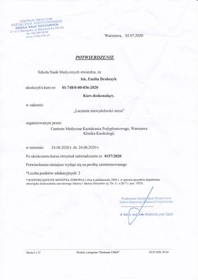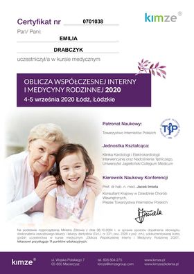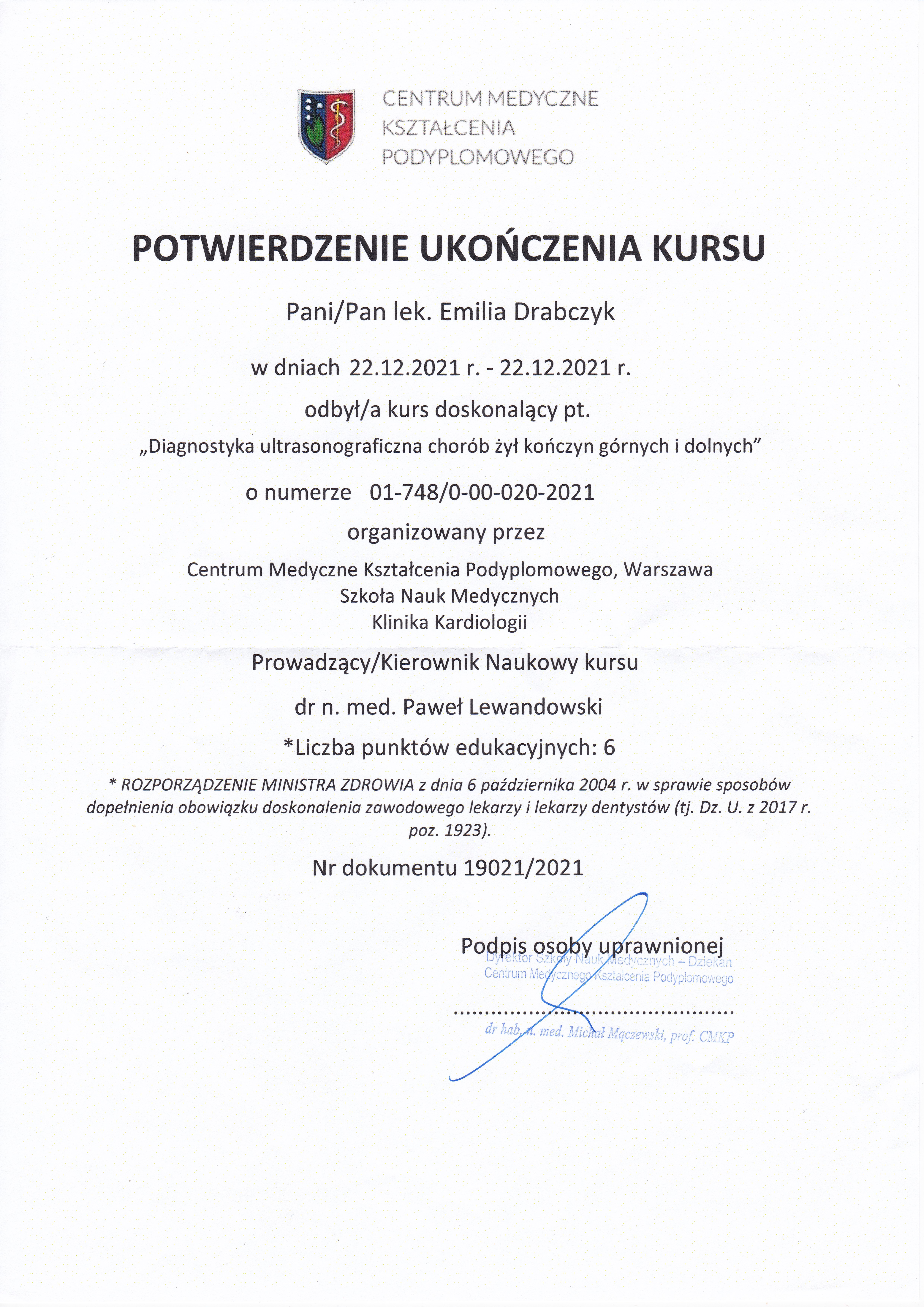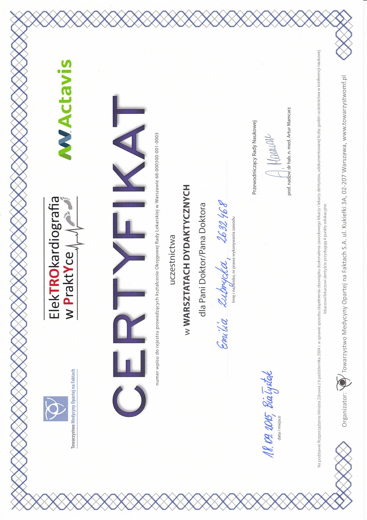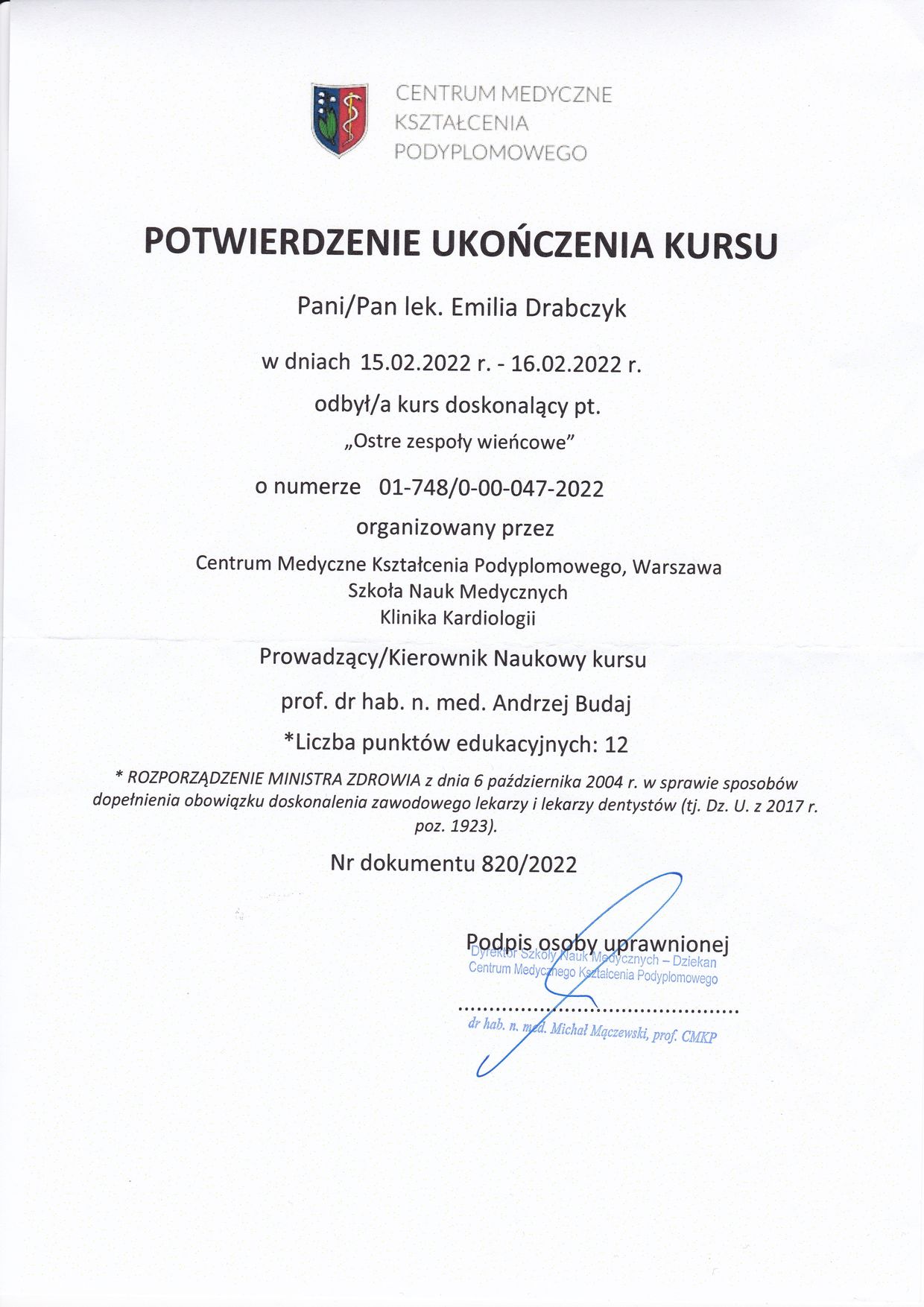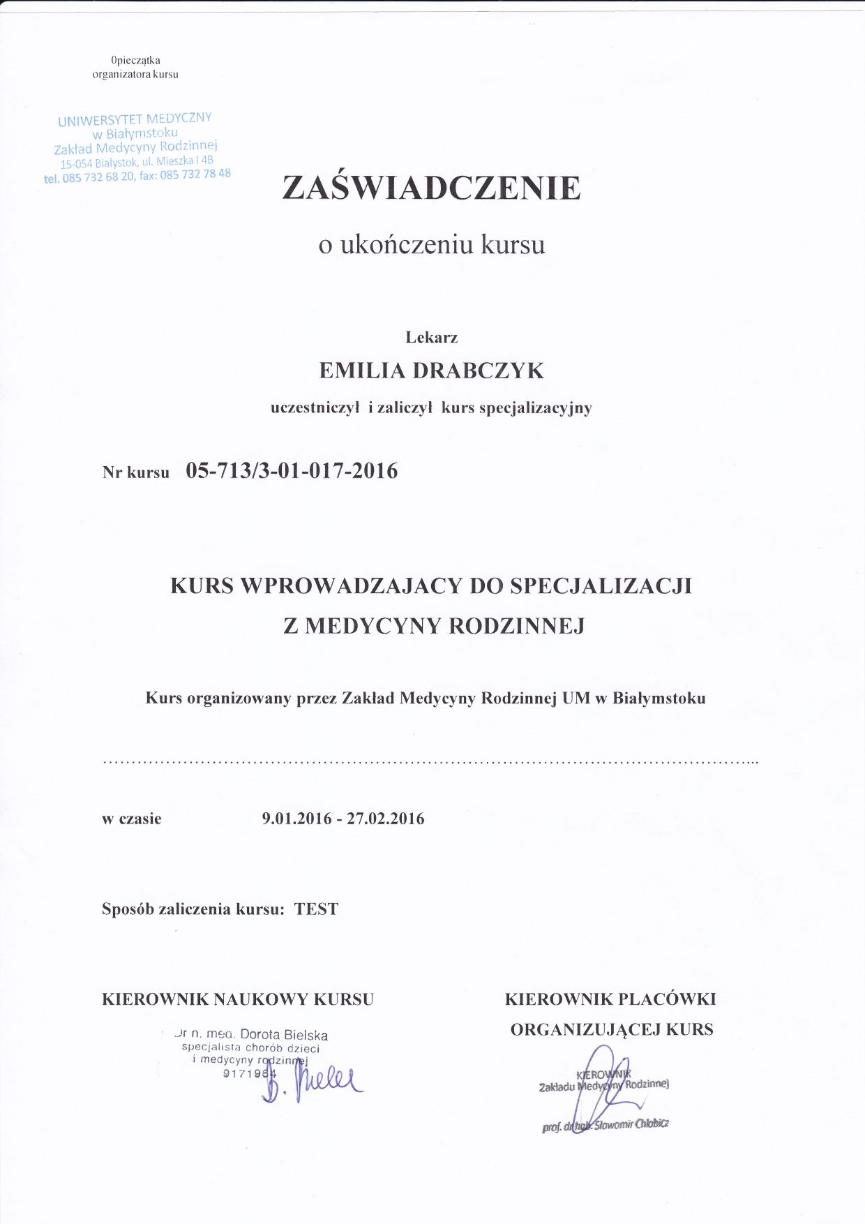 Medycyna uczy pokory, dlatego regularnie podnoszę swoje kwalifikacje uczestnicząc w wykładach, kursach, konferencjach i szkoleniach. Aby zapewnić najwyższe bezpieczeństwo swoim pacjentom oraz leczenie na wysokim poziomie, cały czas podnoszę swoje kompetencje i umiejętności zawodowe, często wykraczając poza ramy medycyny rodzinnej. Poniżej znajduje się galeria z certyfikatami z niektórych kursów.