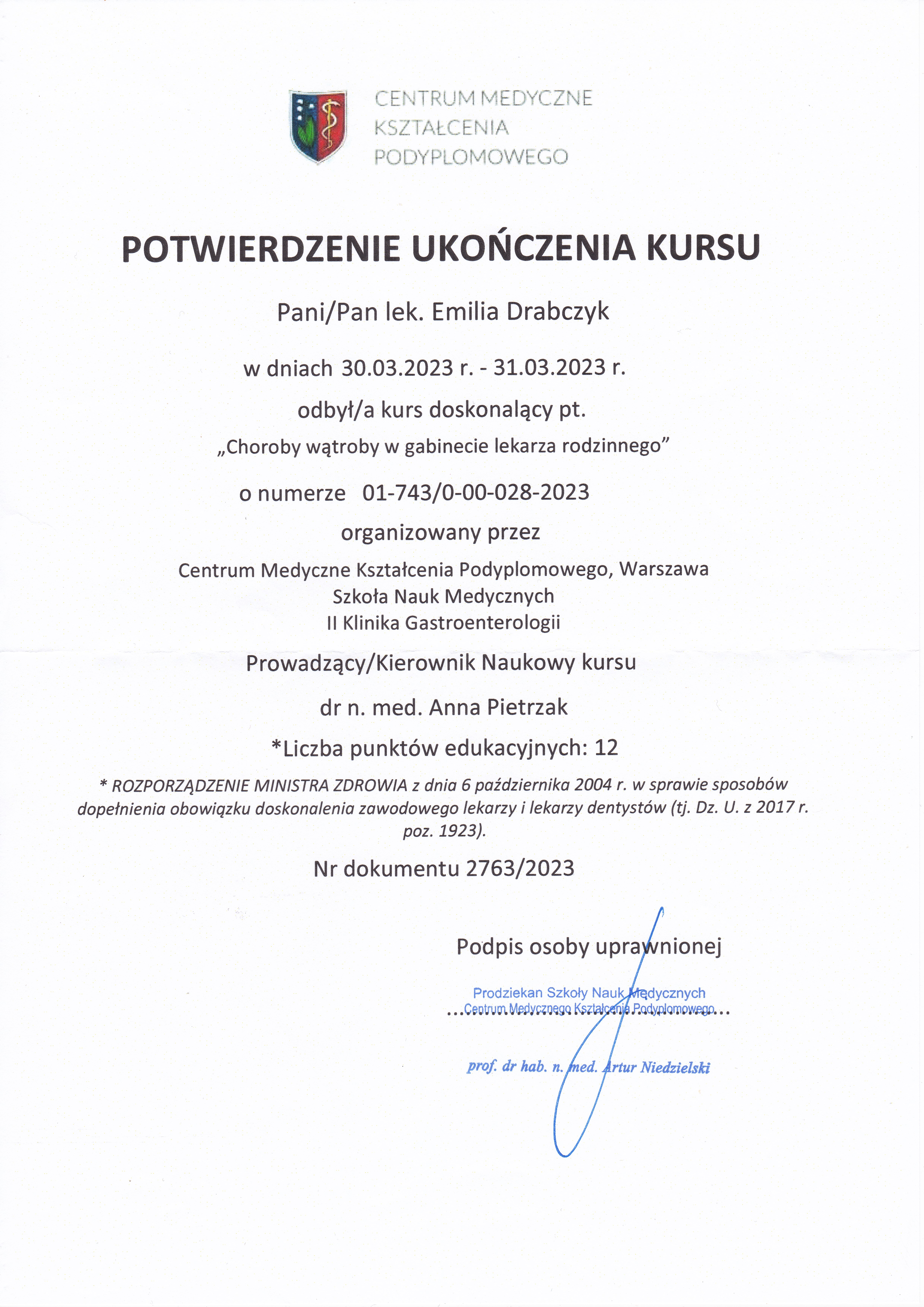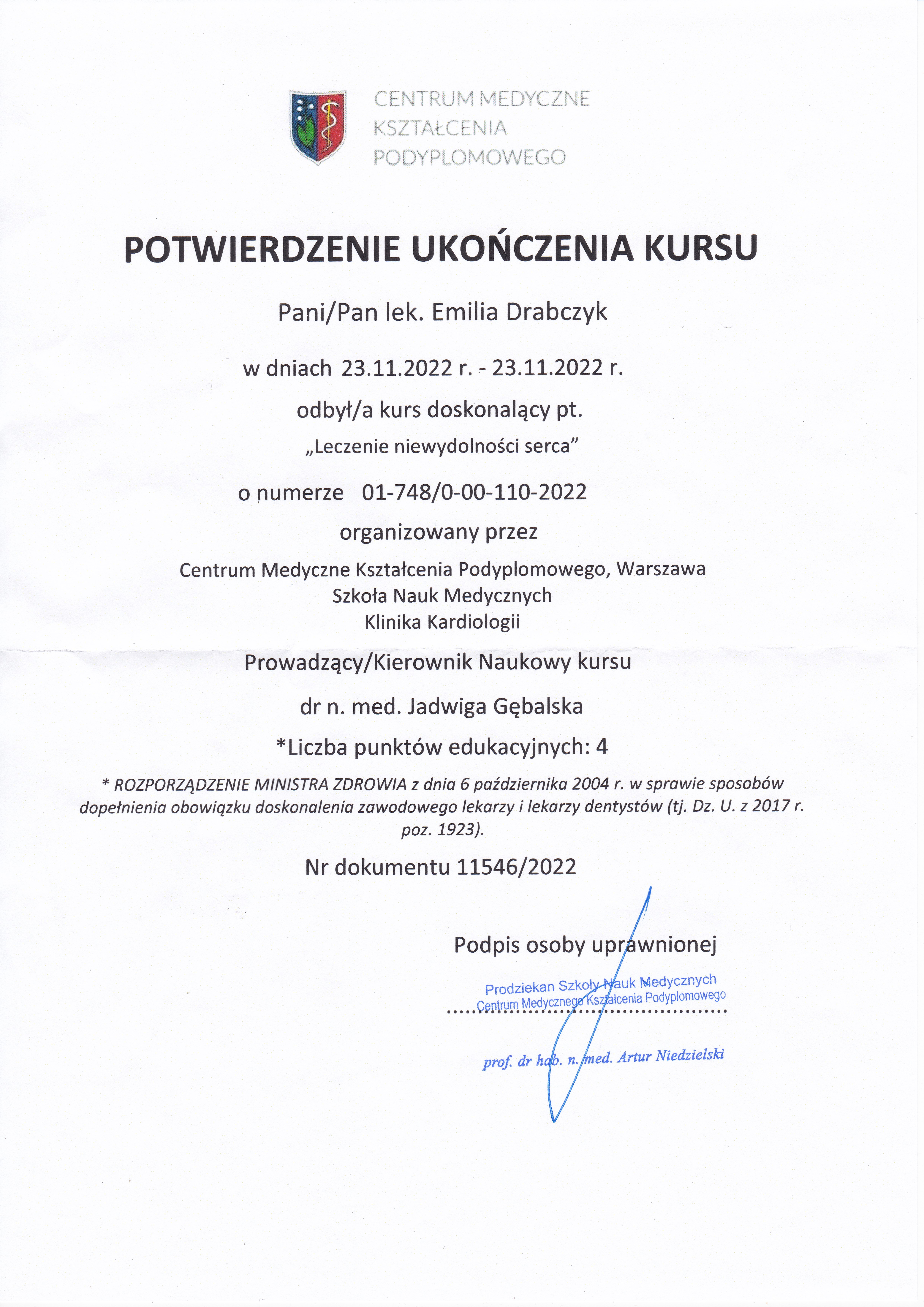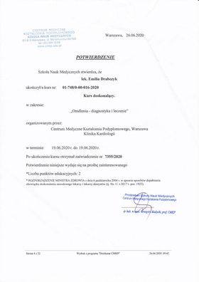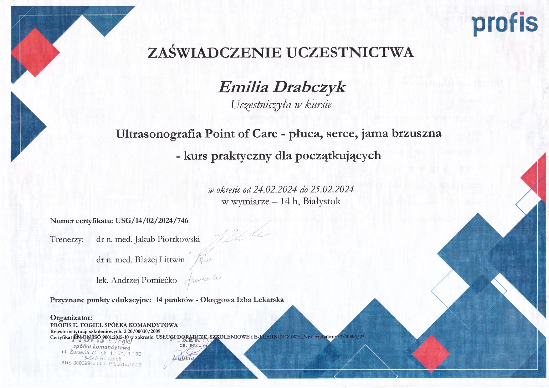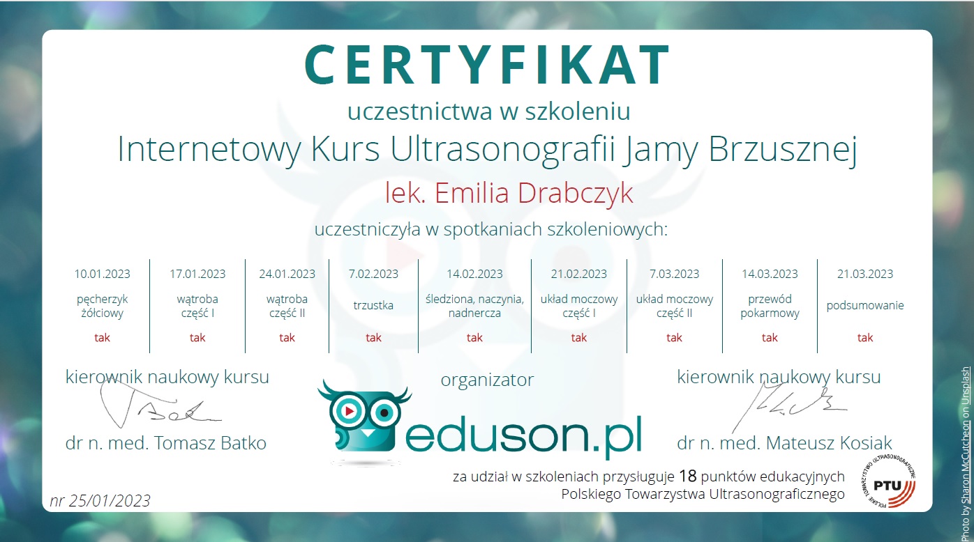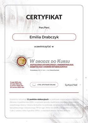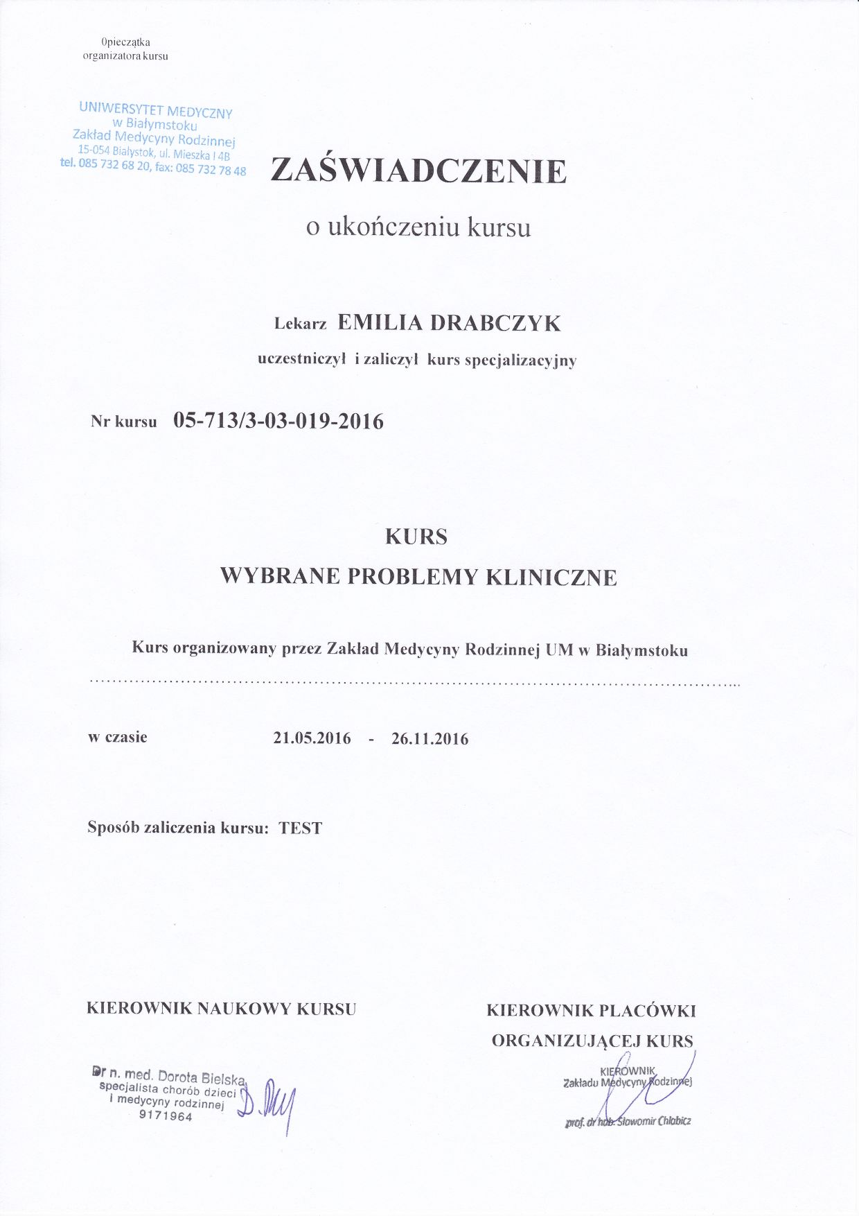 Medycyna uczy pokory, dlatego regularnie podnoszę swoje kwalifikacje uczestnicząc w wykładach, kursach, konferencjach i szkoleniach. Aby zapewnić najwyższe bezpieczeństwo swoim pacjentom oraz leczenie na wysokim poziomie, cały czas podnoszę swoje kompetencje i umiejętności zawodowe, często wykraczając poza ramy medycyny rodzinnej. Poniżej znajduje się galeria z certyfikatami z niektórych kursów.