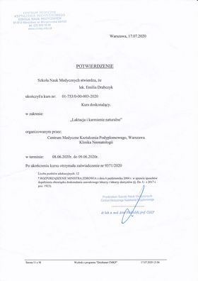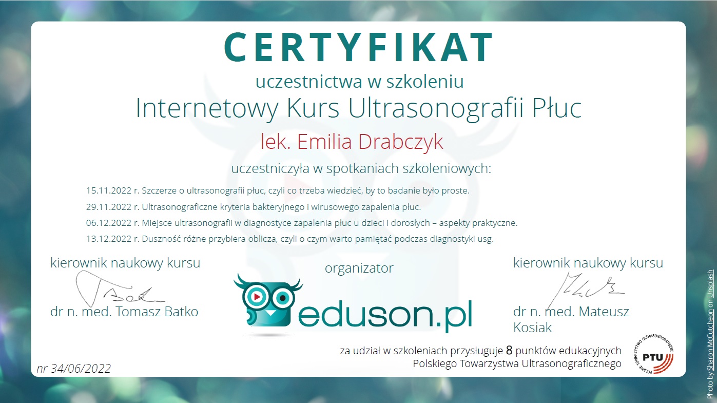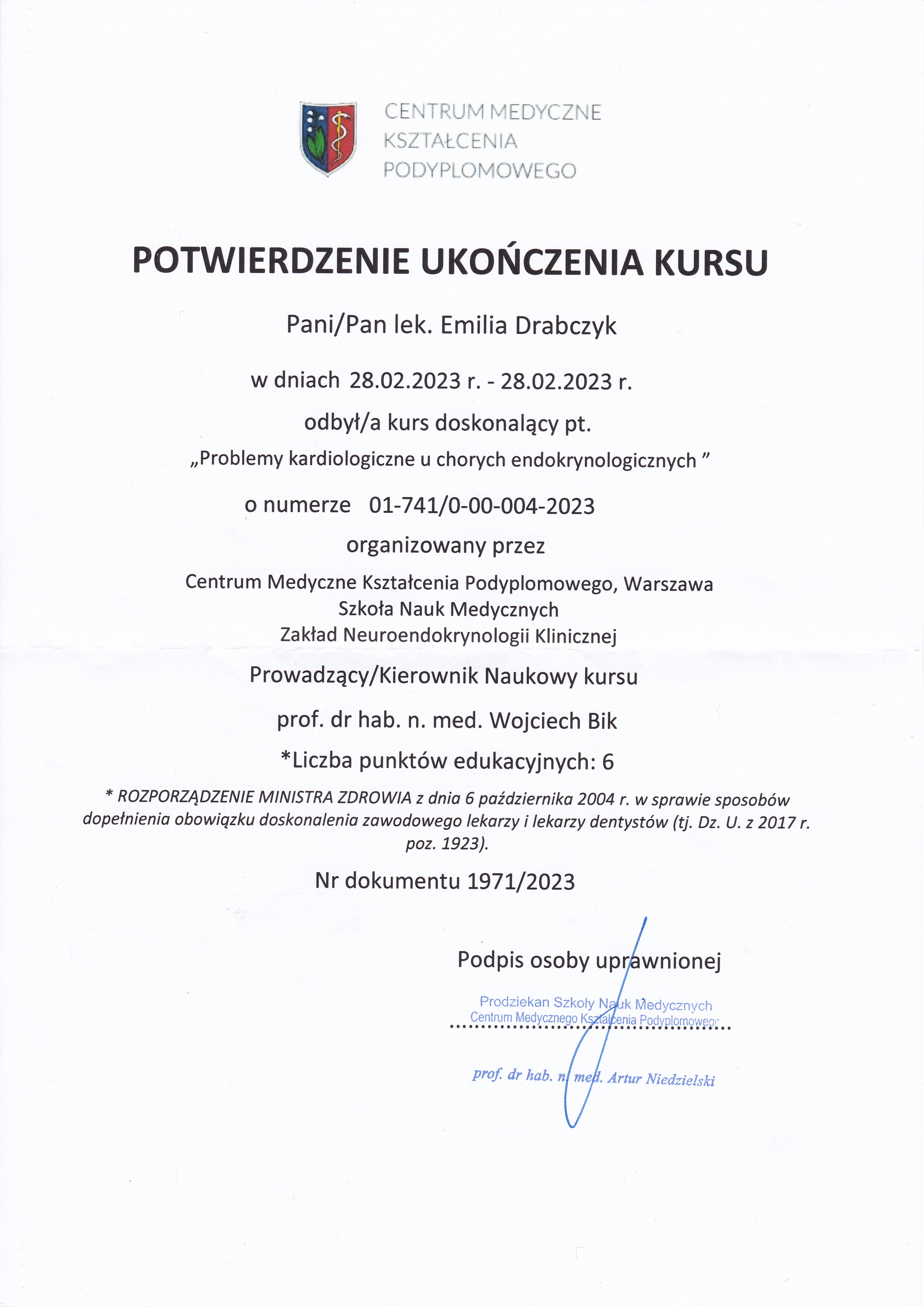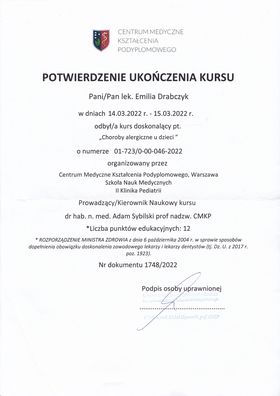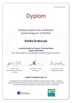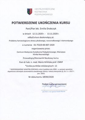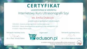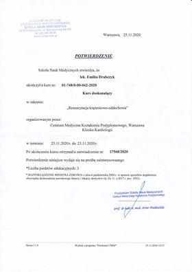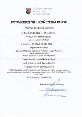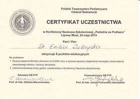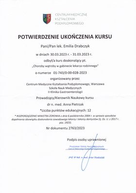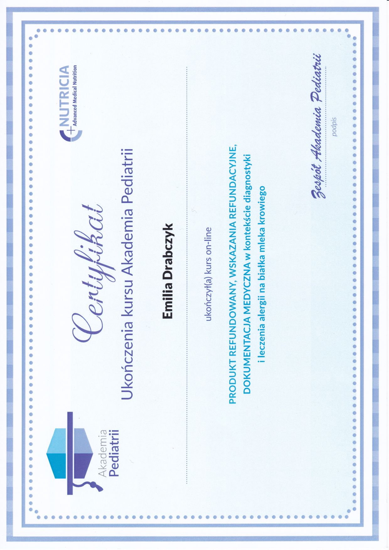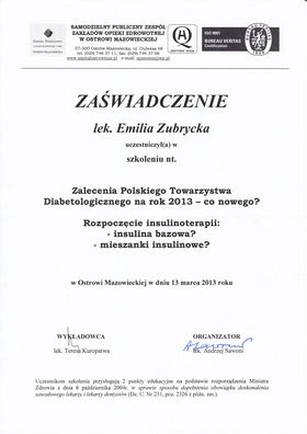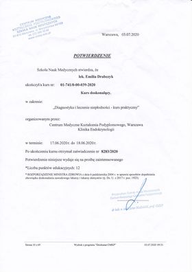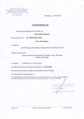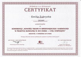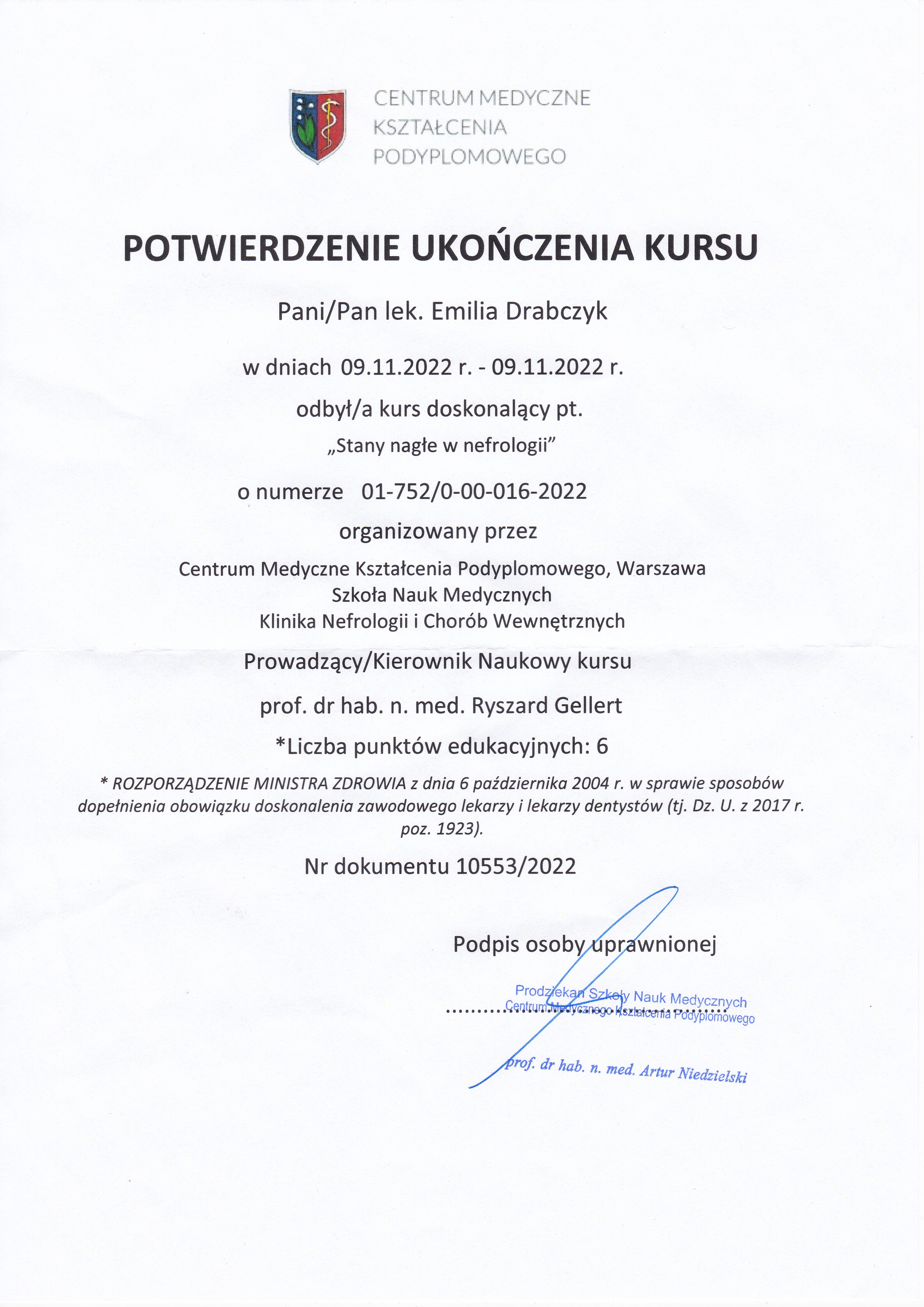 Medycyna uczy pokory, dlatego regularnie podnoszę swoje kwalifikacje uczestnicząc w wykładach, kursach, konferencjach i szkoleniach. Aby zapewnić najwyższe bezpieczeństwo swoim pacjentom oraz leczenie na wysokim poziomie, cały czas podnoszę swoje kompetencje i umiejętności zawodowe, często wykraczając poza ramy medycyny rodzinnej. Poniżej znajduje się galeria z certyfikatami z niektórych kursów.