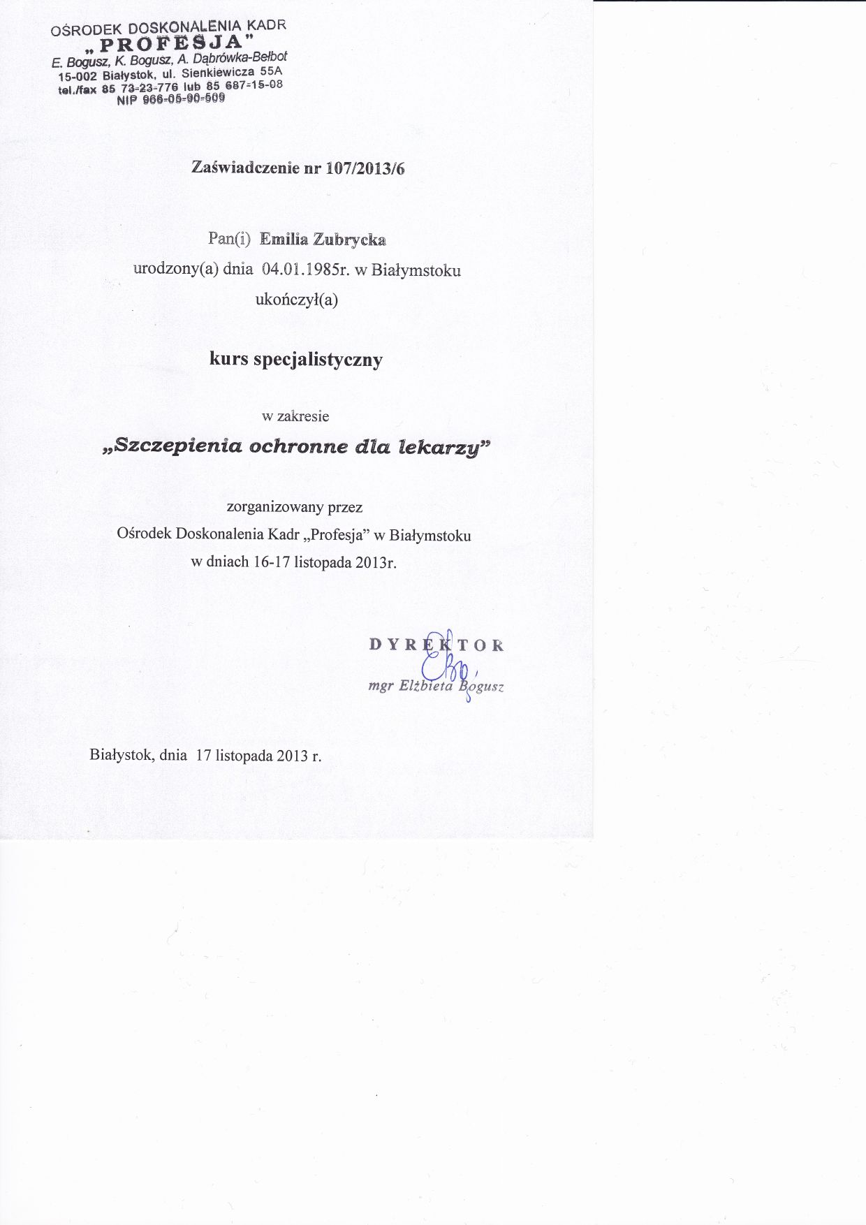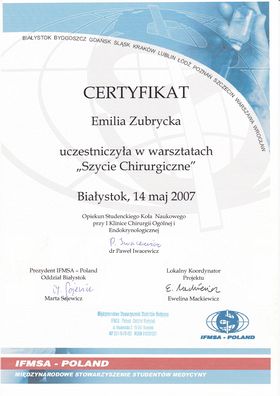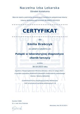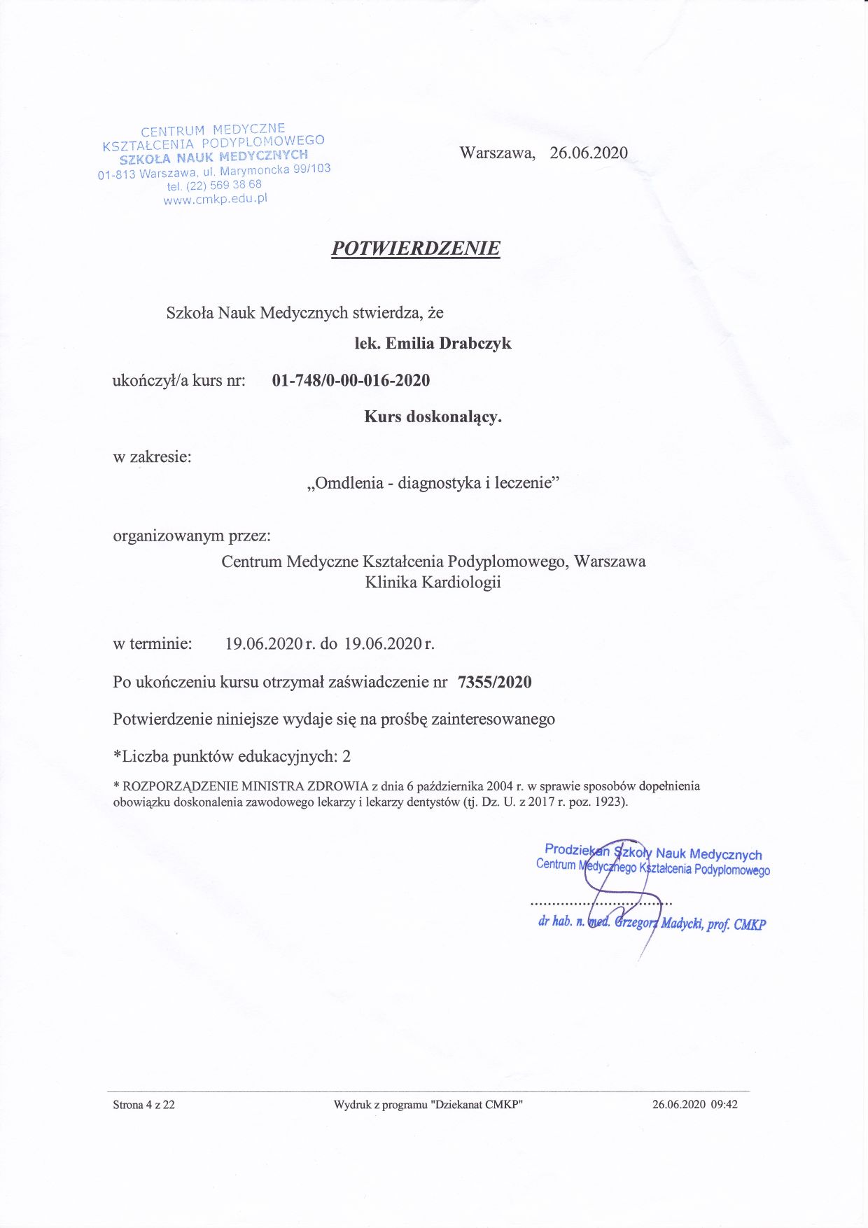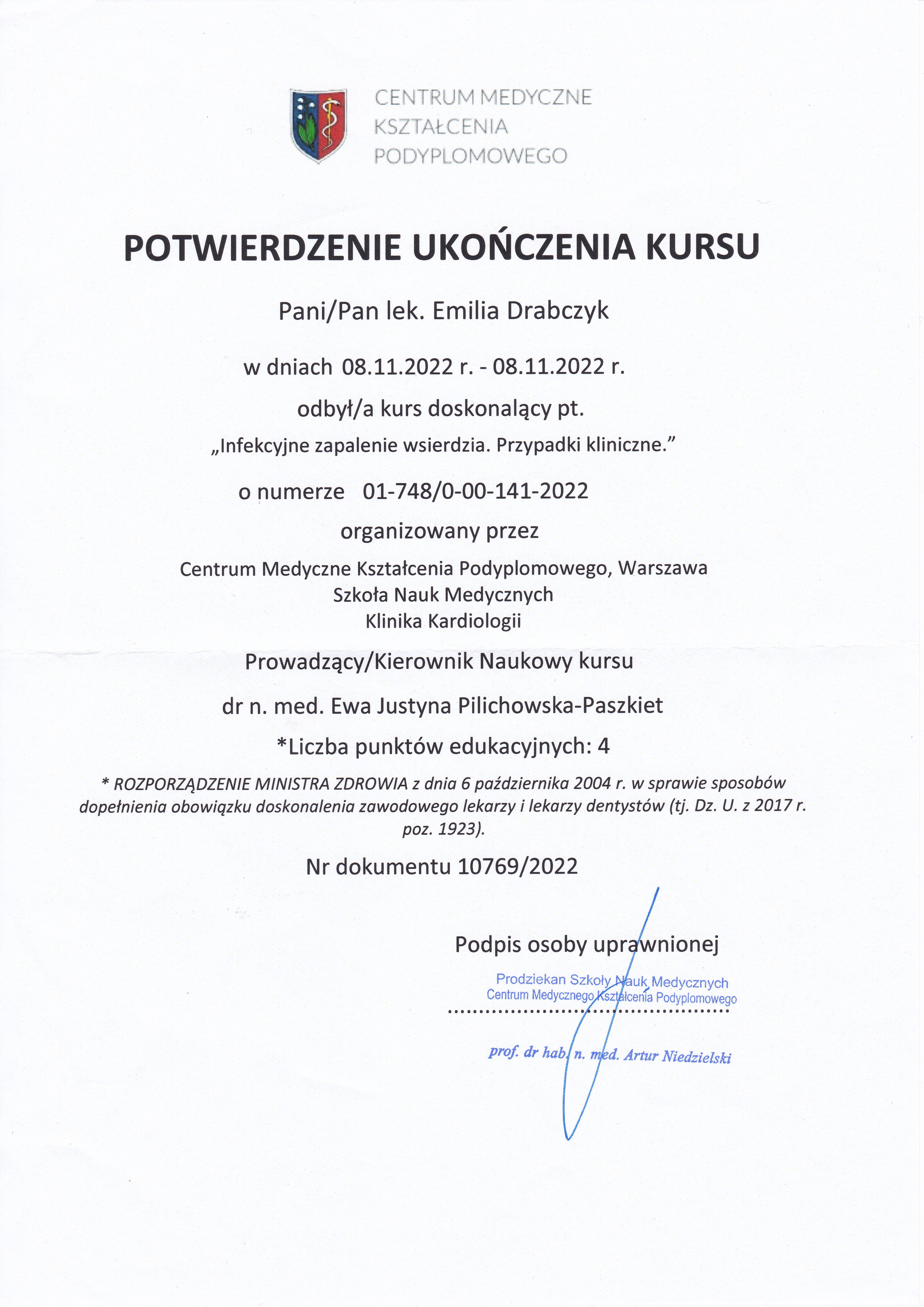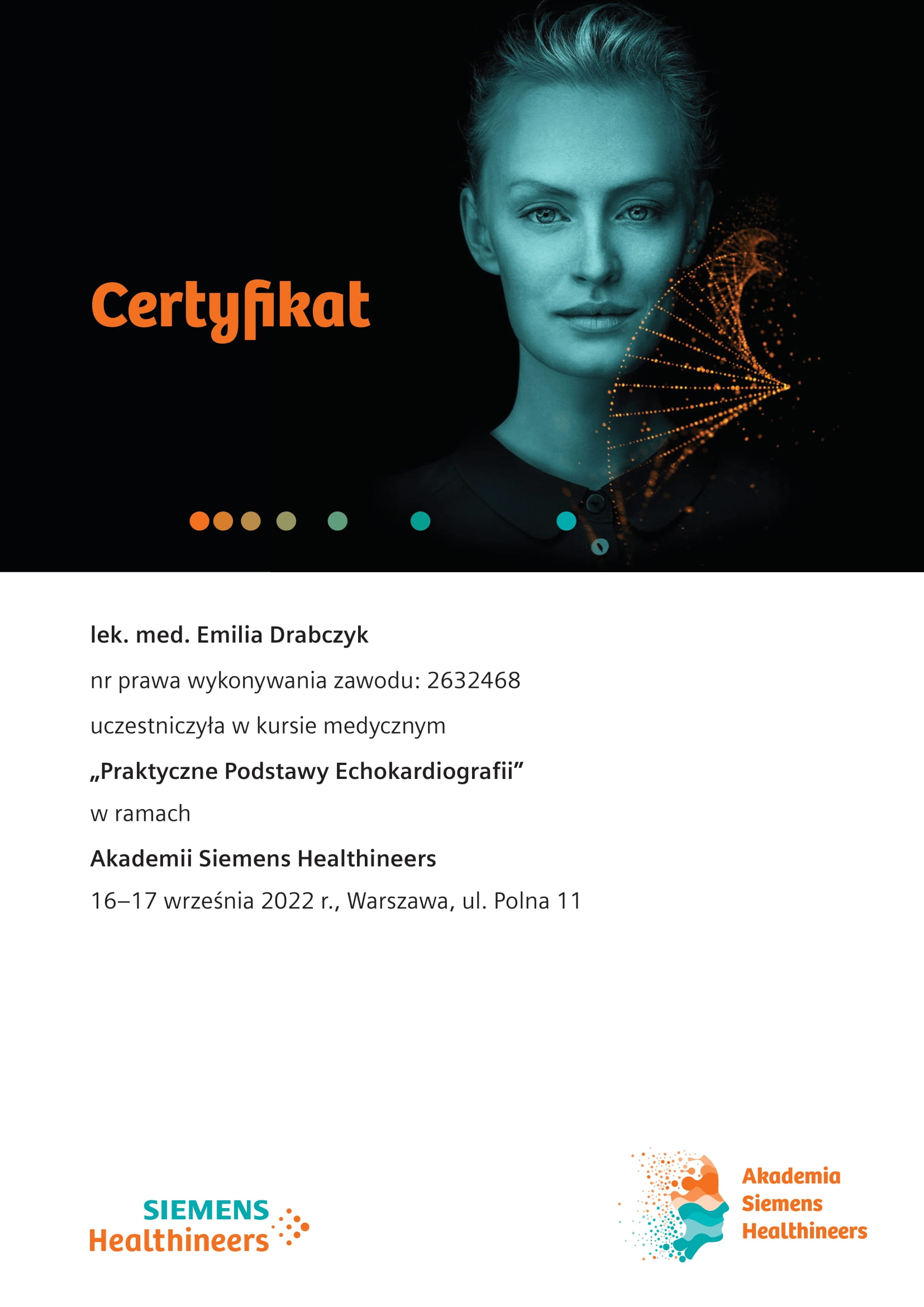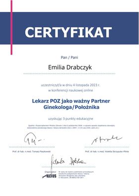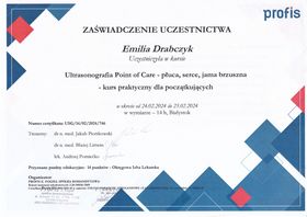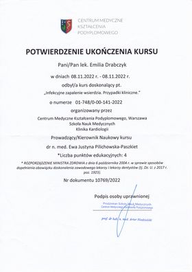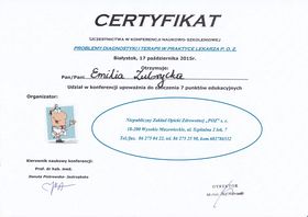 Medycyna uczy pokory, dlatego regularnie podnoszę swoje kwalifikacje uczestnicząc w wykładach, kursach, konferencjach i szkoleniach. Aby zapewnić najwyższe bezpieczeństwo swoim pacjentom oraz leczenie na wysokim poziomie, cały czas podnoszę swoje kompetencje i umiejętności zawodowe, często wykraczając poza ramy medycyny rodzinnej. Poniżej znajduje się galeria z certyfikatami z niektórych kursów.