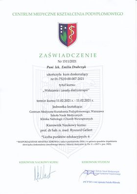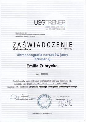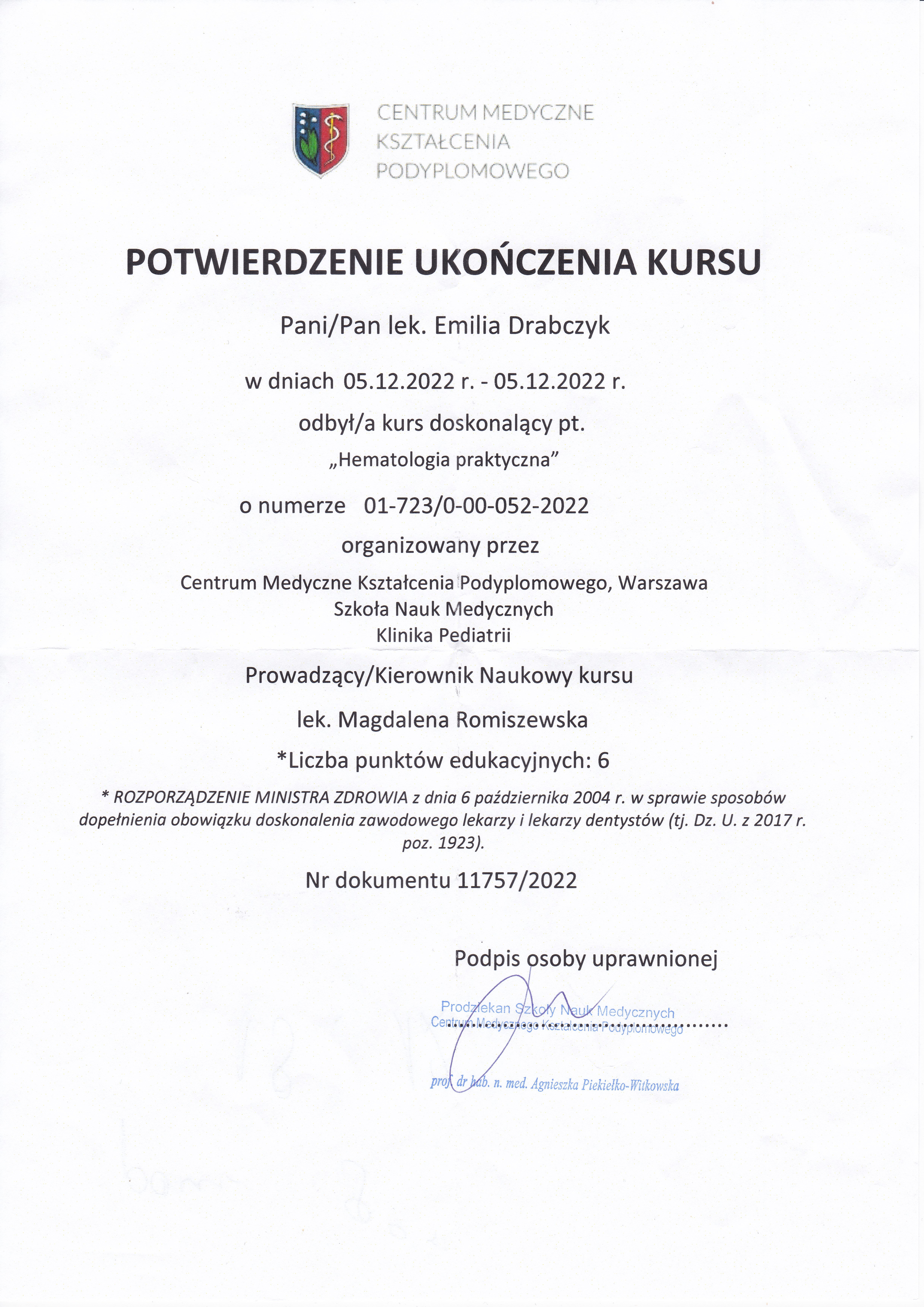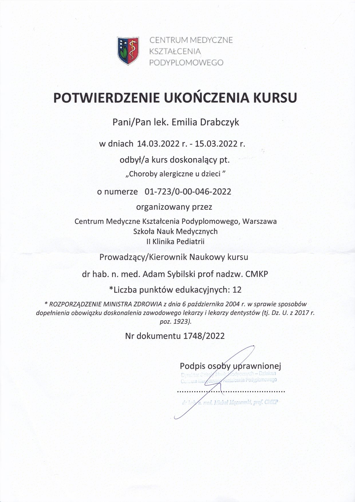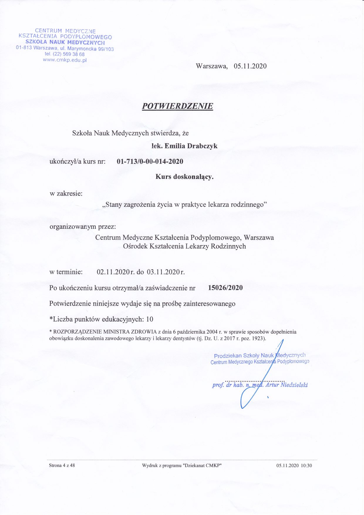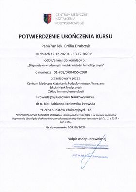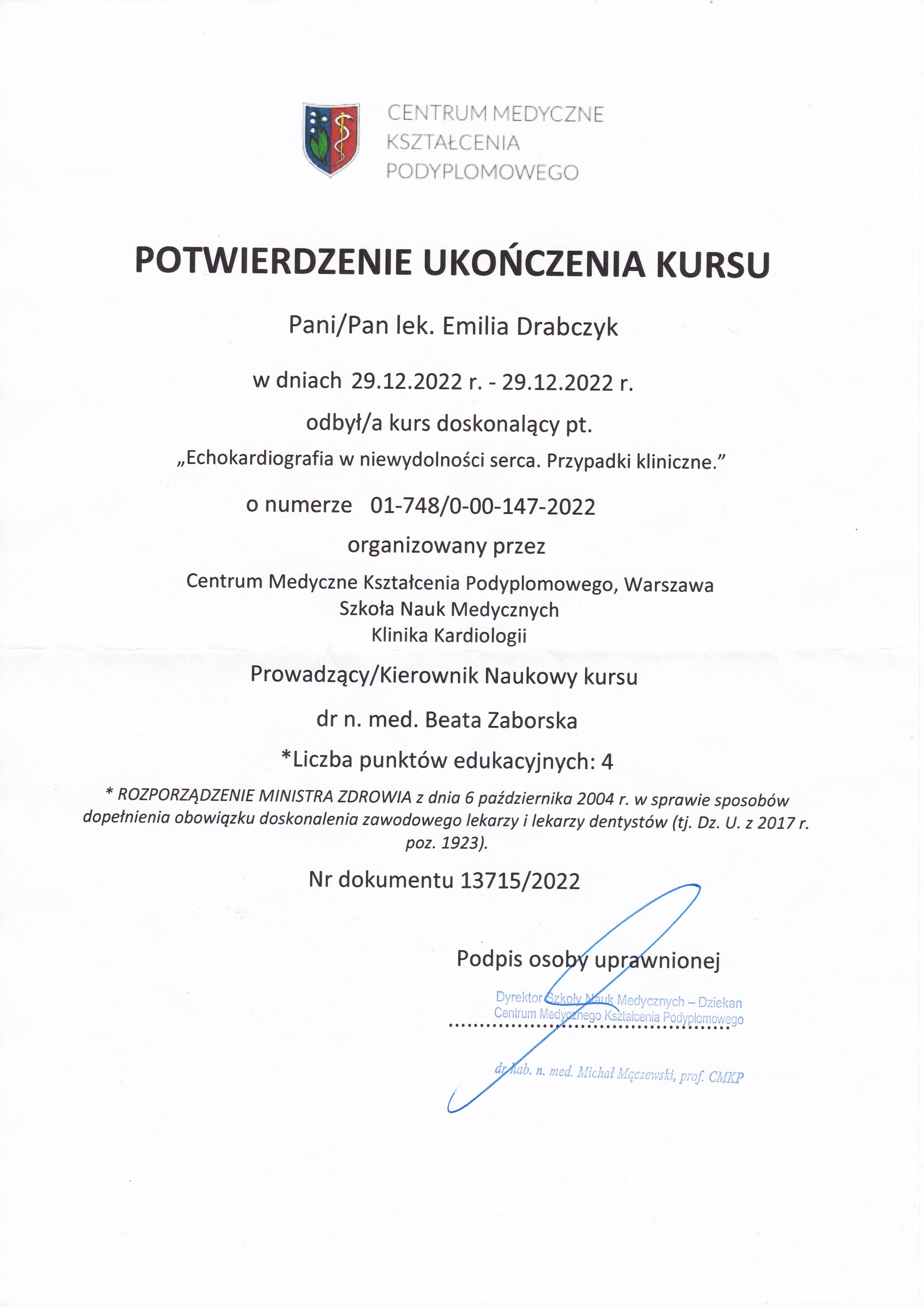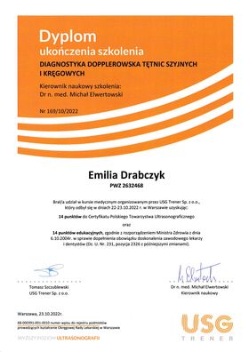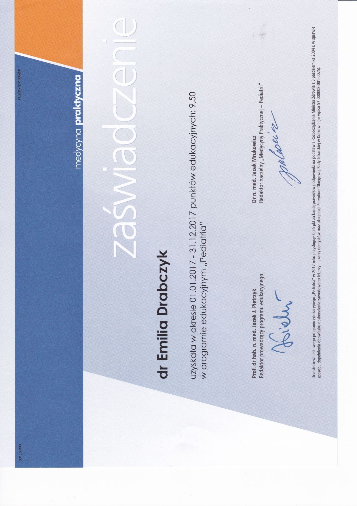Medycyna uczy pokory, dlatego regularnie podnoszę swoje kwalifikacje uczestnicząc w wykładach, kursach, konferencjach i szkoleniach. Aby zapewnić najwyższe bezpieczeństwo swoim pacjentom oraz leczenie na wysokim poziomie, cały czas podnoszę swoje kompetencje i umiejętności zawodowe, często wykraczając poza ramy medycyny rodzinnej. Poniżej znajduje się galeria z certyfikatami z niektórych kursów.