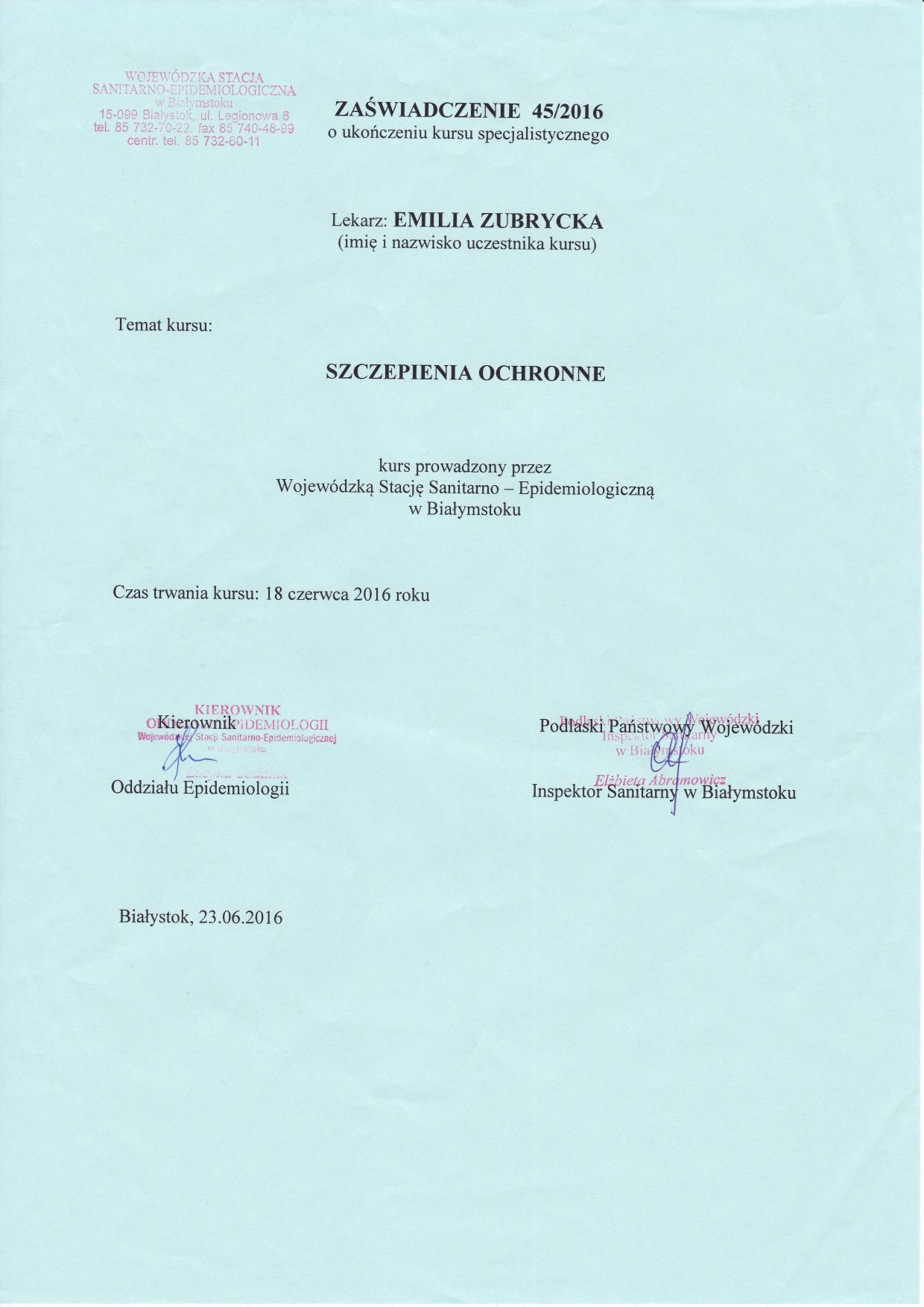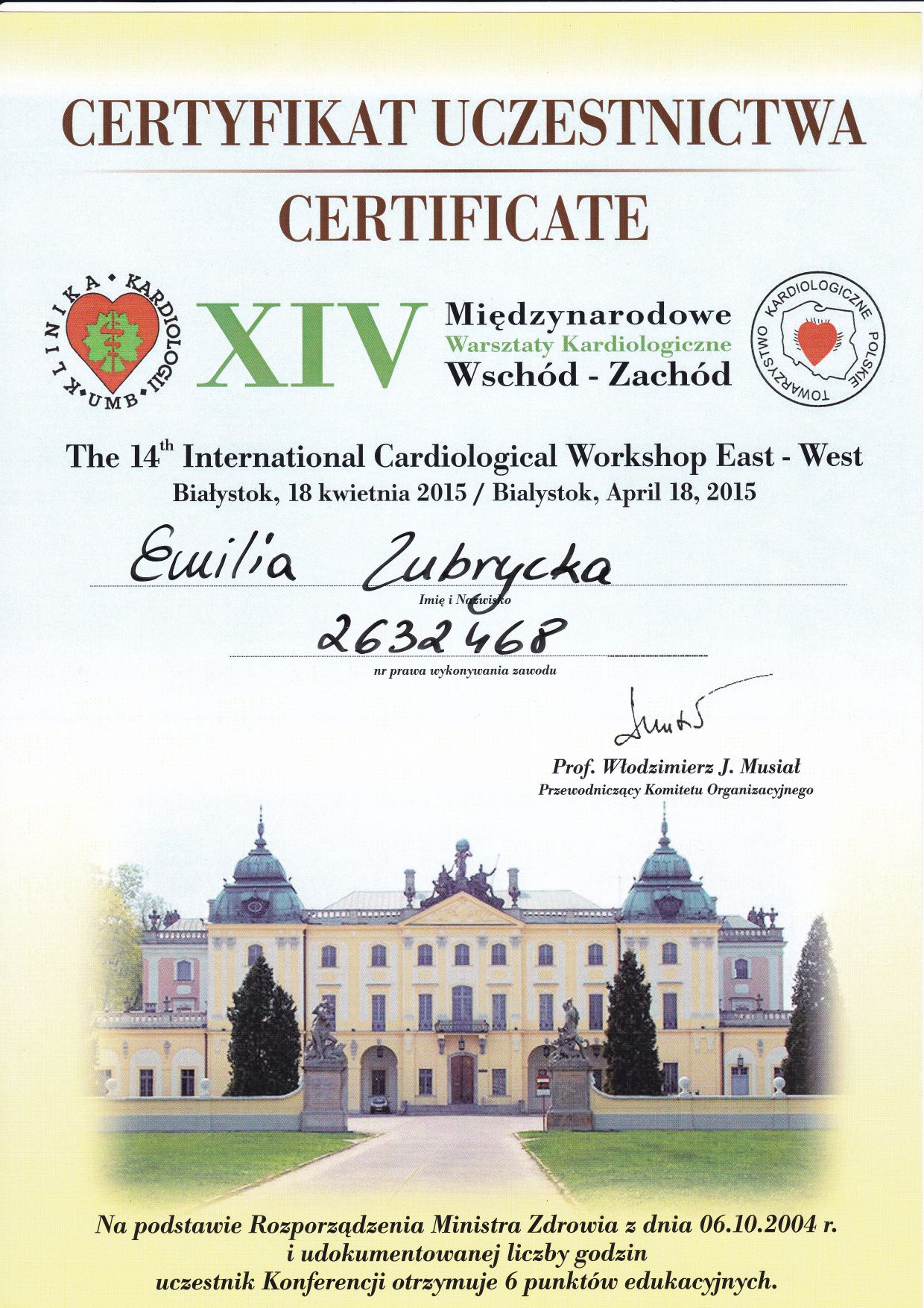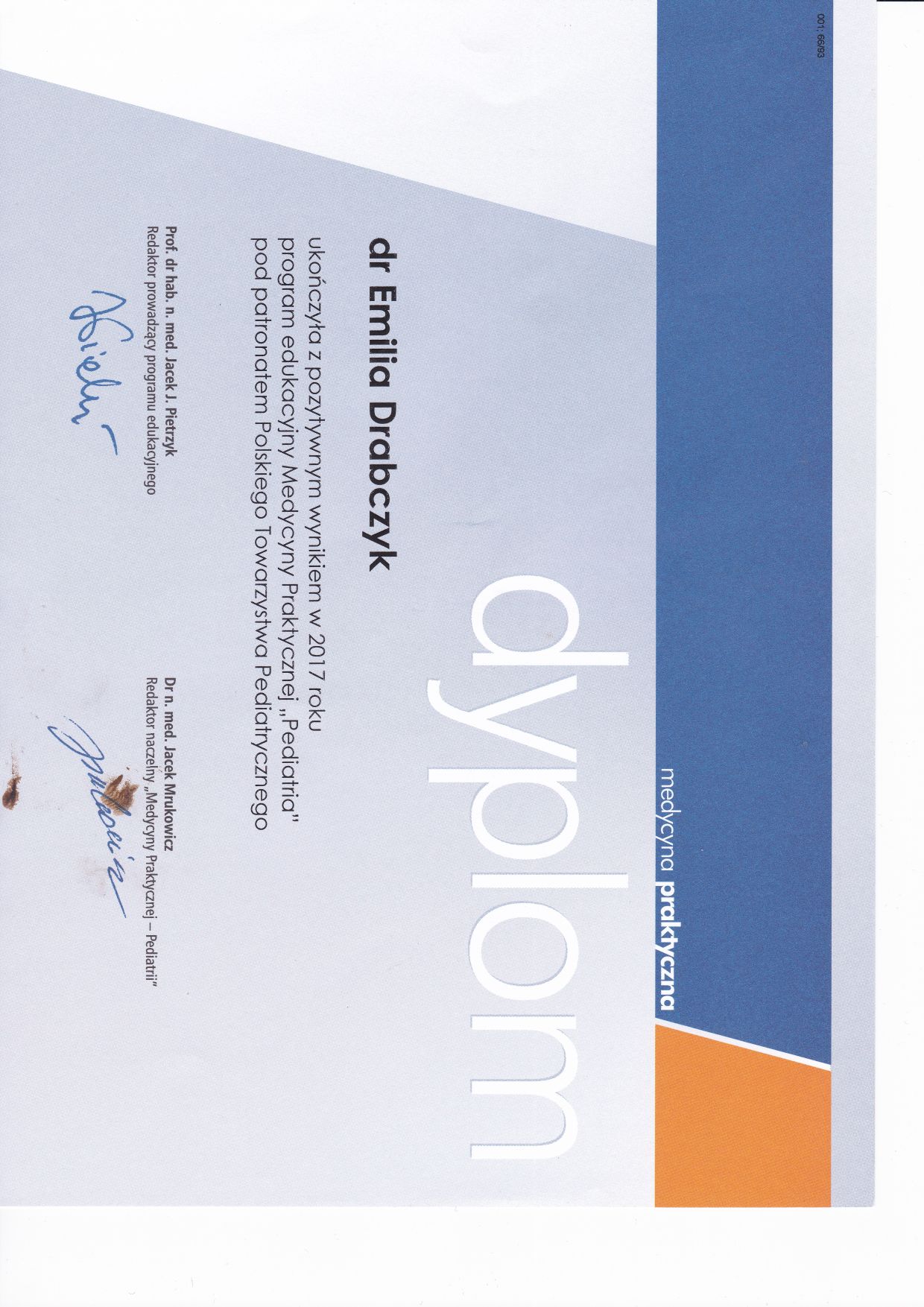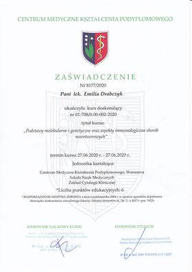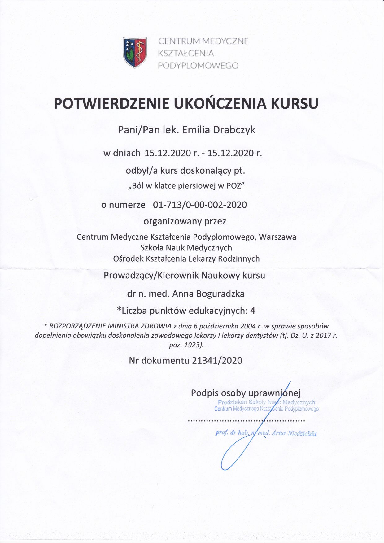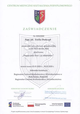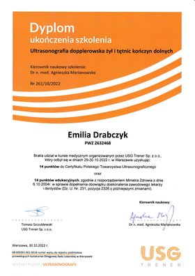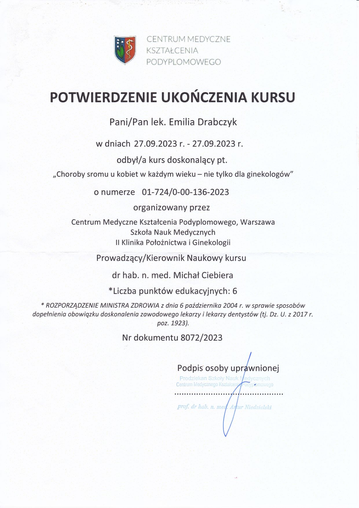 Medycyna uczy pokory, dlatego regularnie podnoszę swoje kwalifikacje uczestnicząc w wykładach, kursach, konferencjach i szkoleniach. Aby zapewnić najwyższe bezpieczeństwo swoim pacjentom oraz leczenie na wysokim poziomie, cały czas podnoszę swoje kompetencje i umiejętności zawodowe, często wykraczając poza ramy medycyny rodzinnej. Poniżej znajduje się galeria z certyfikatami z niektórych kursów.