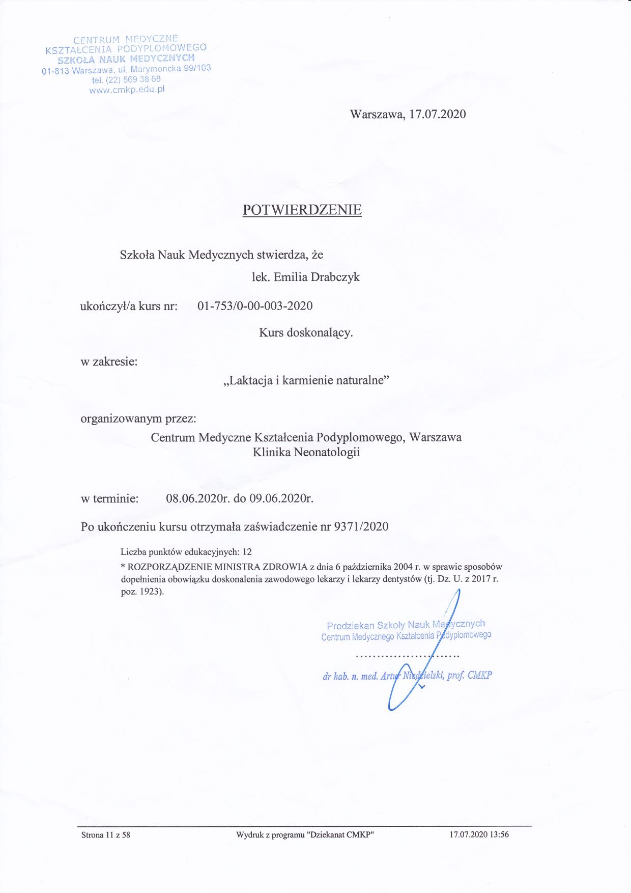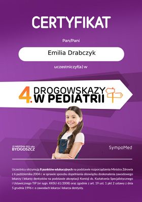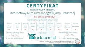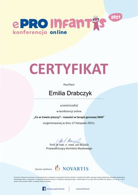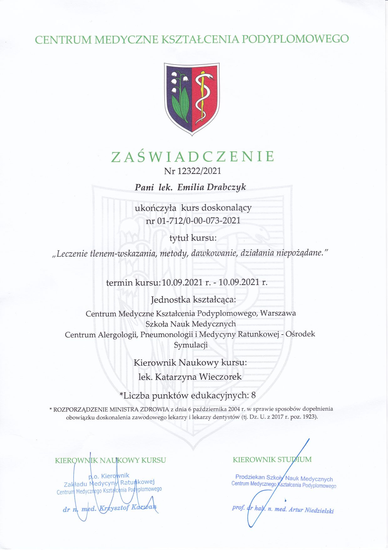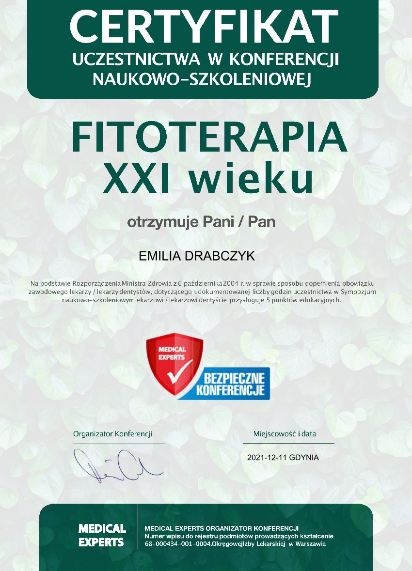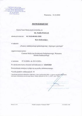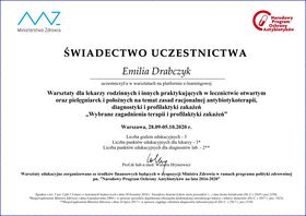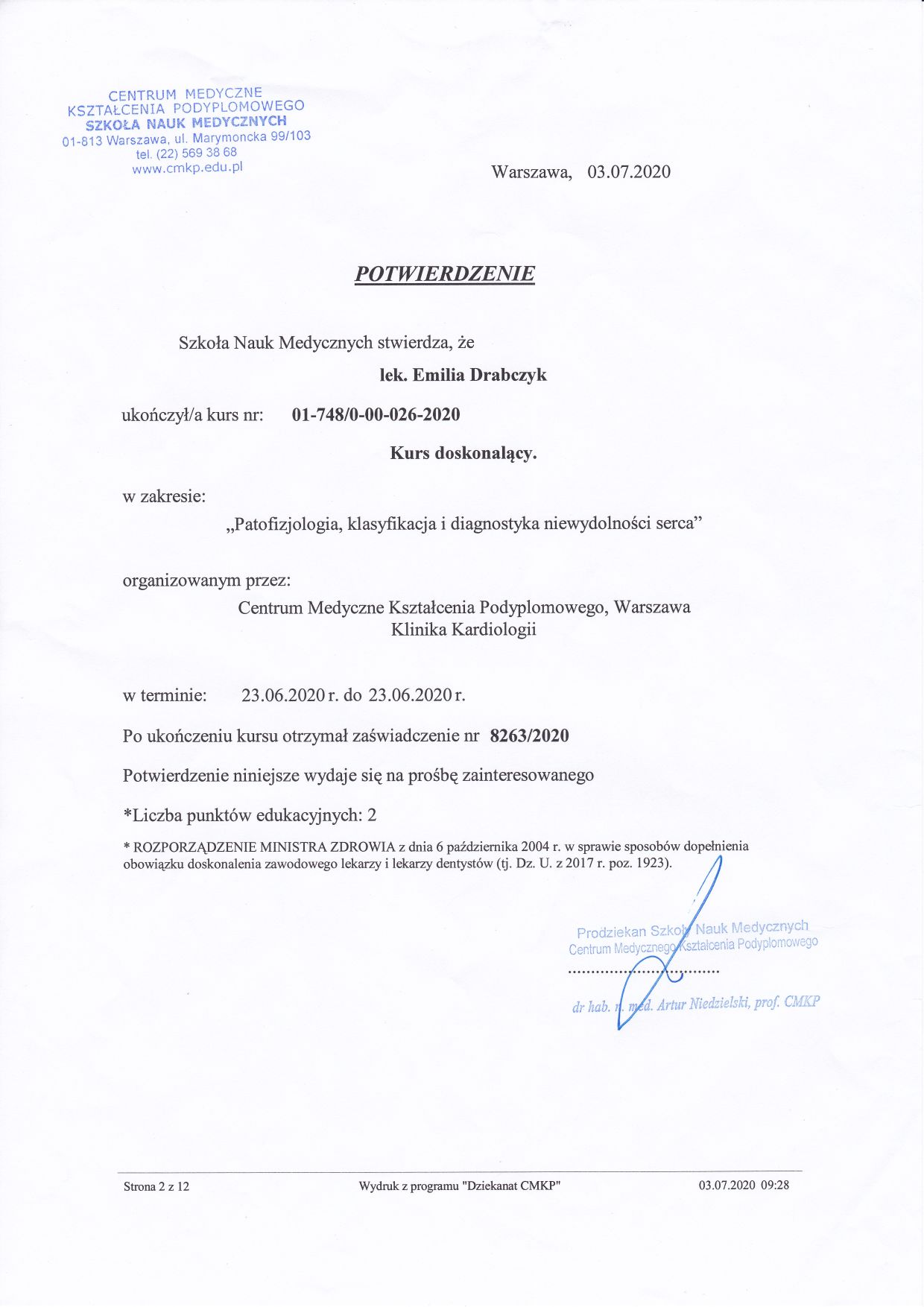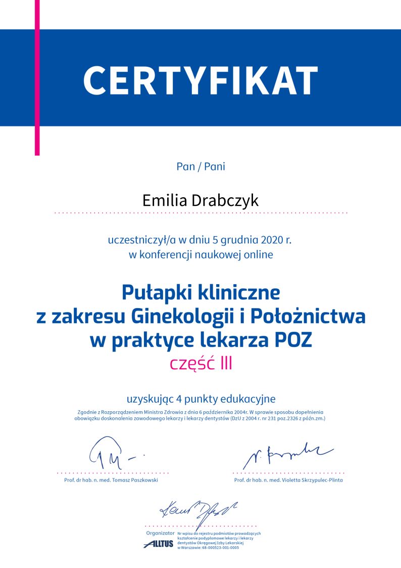 Medycyna uczy pokory, dlatego regularnie podnoszę swoje kwalifikacje uczestnicząc w wykładach, kursach, konferencjach i szkoleniach. Aby zapewnić najwyższe bezpieczeństwo swoim pacjentom oraz leczenie na wysokim poziomie, cały czas podnoszę swoje kompetencje i umiejętności zawodowe, często wykraczając poza ramy medycyny rodzinnej. Poniżej znajduje się galeria z certyfikatami z niektórych kursów.