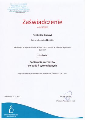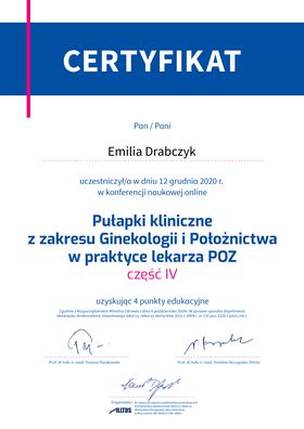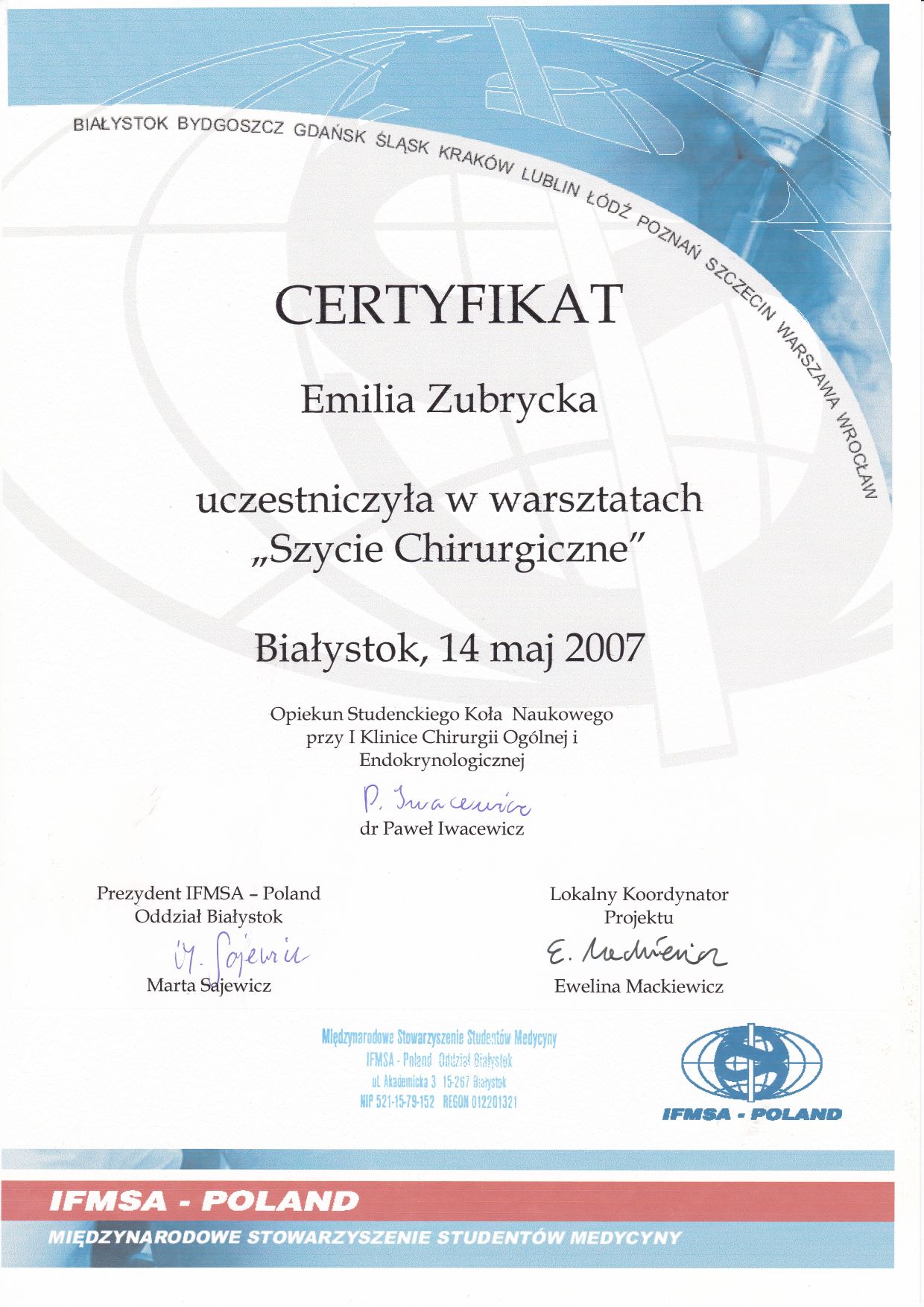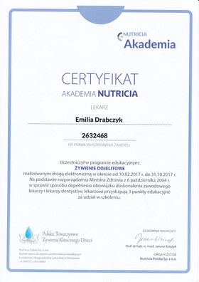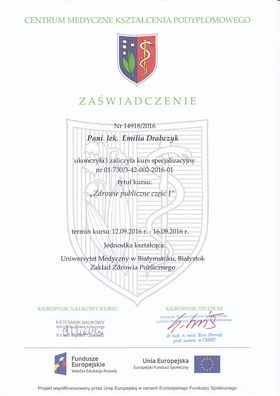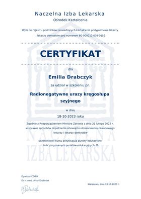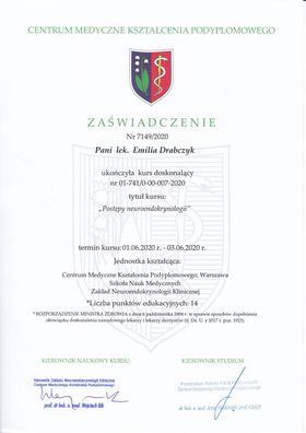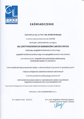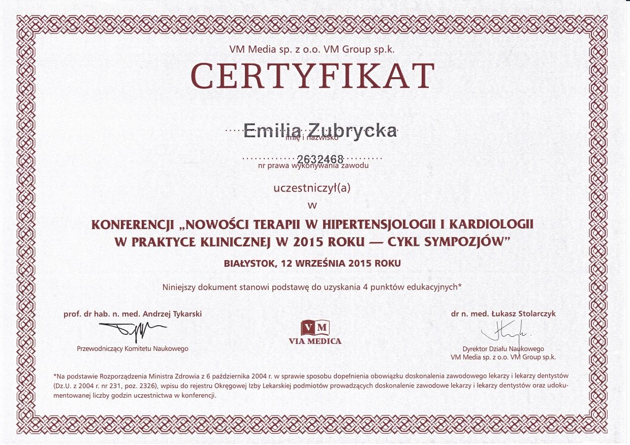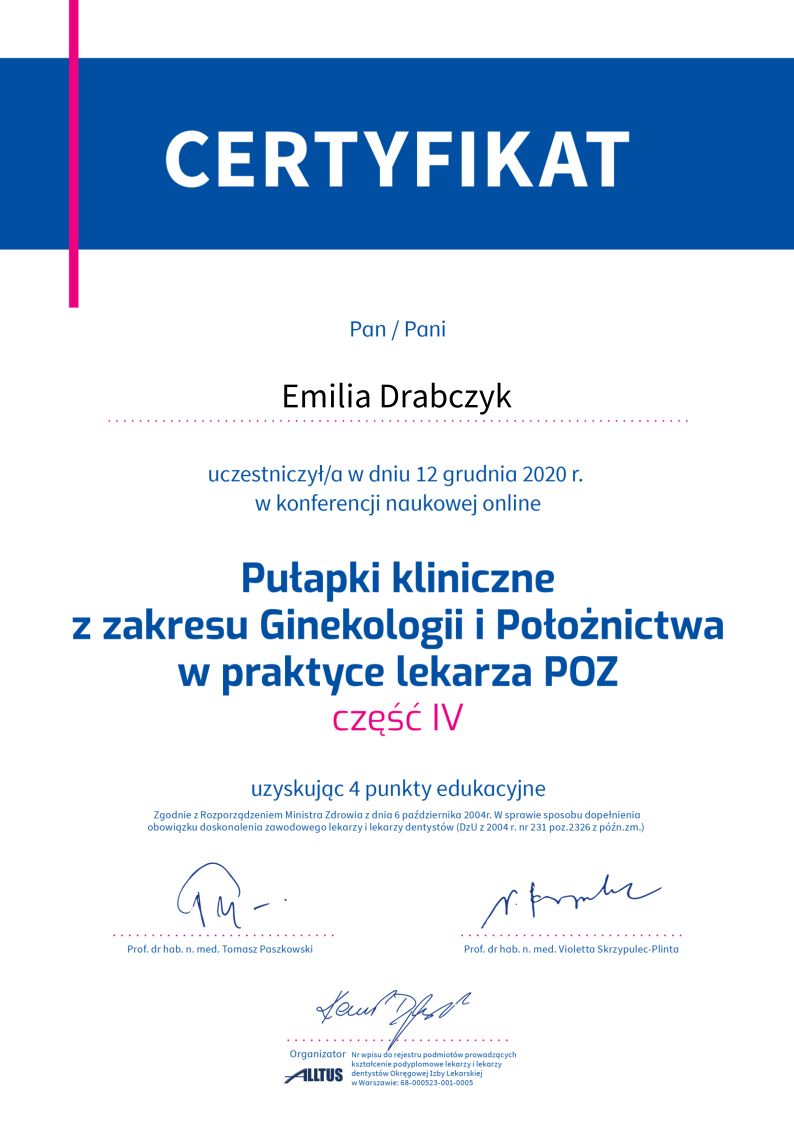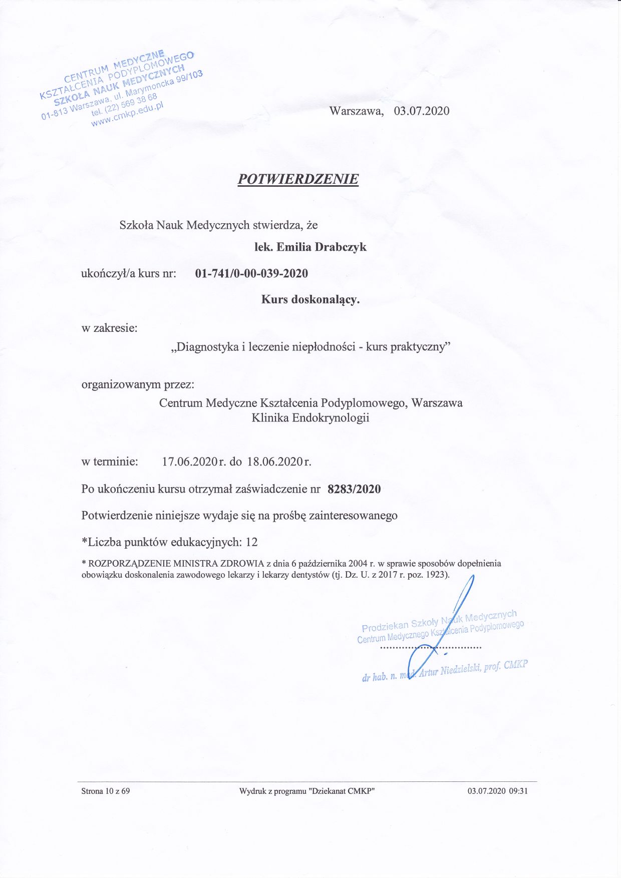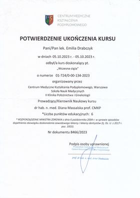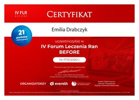 Medycyna uczy pokory, dlatego regularnie podnoszę swoje kwalifikacje uczestnicząc w wykładach, kursach, konferencjach i szkoleniach. Aby zapewnić najwyższe bezpieczeństwo swoim pacjentom oraz leczenie na wysokim poziomie, cały czas podnoszę swoje kompetencje i umiejętności zawodowe, często wykraczając poza ramy medycyny rodzinnej. Poniżej znajduje się galeria z certyfikatami z niektórych kursów.