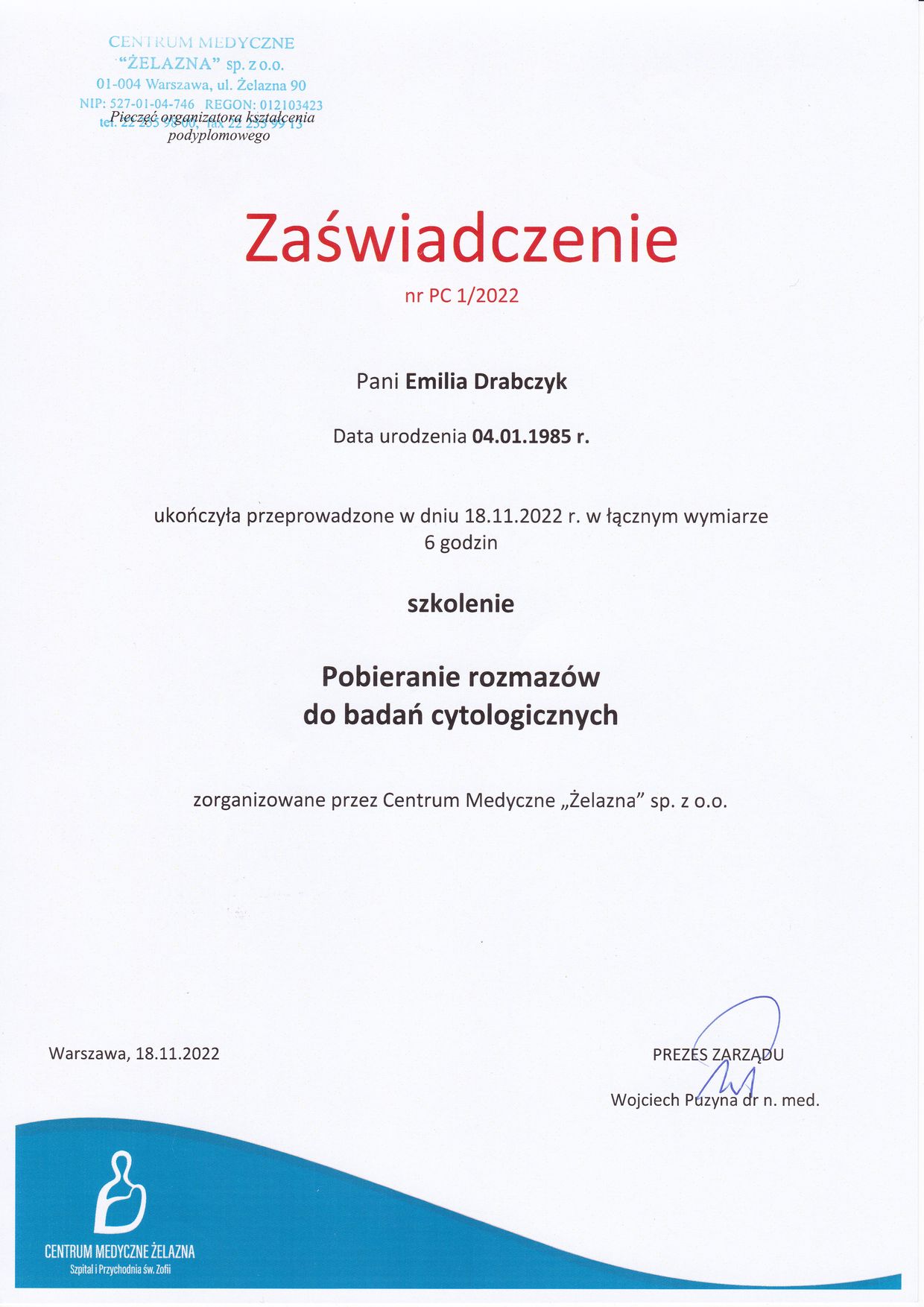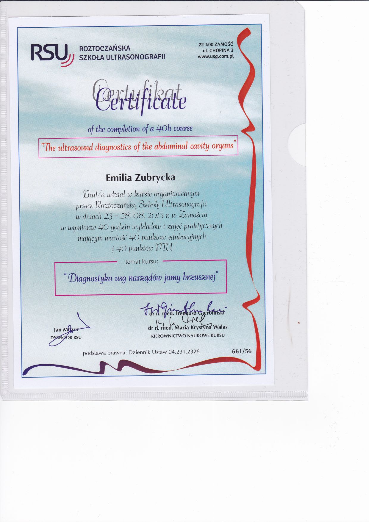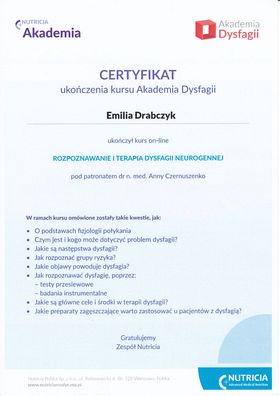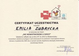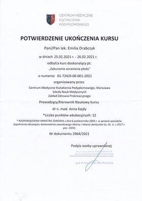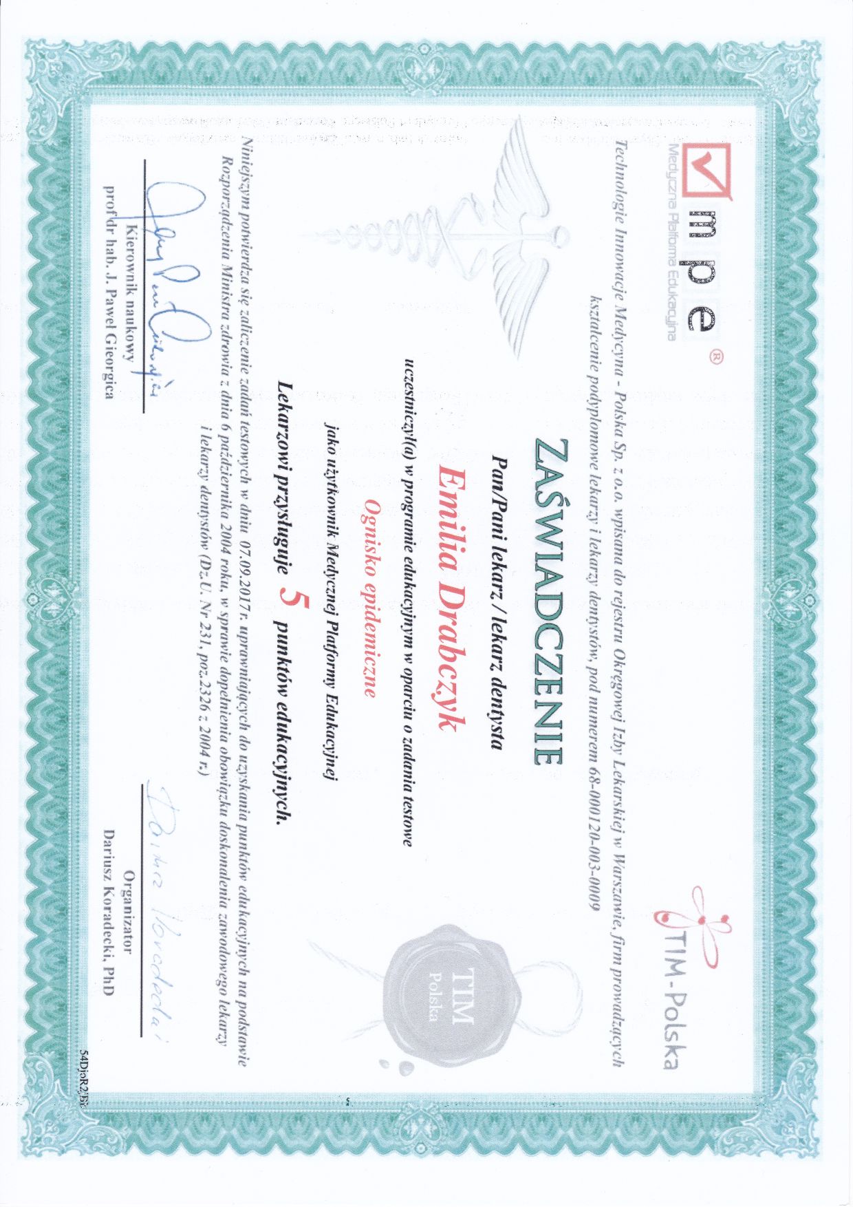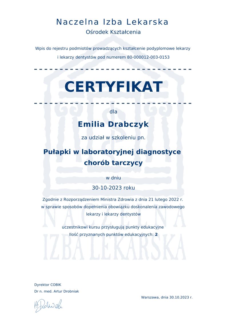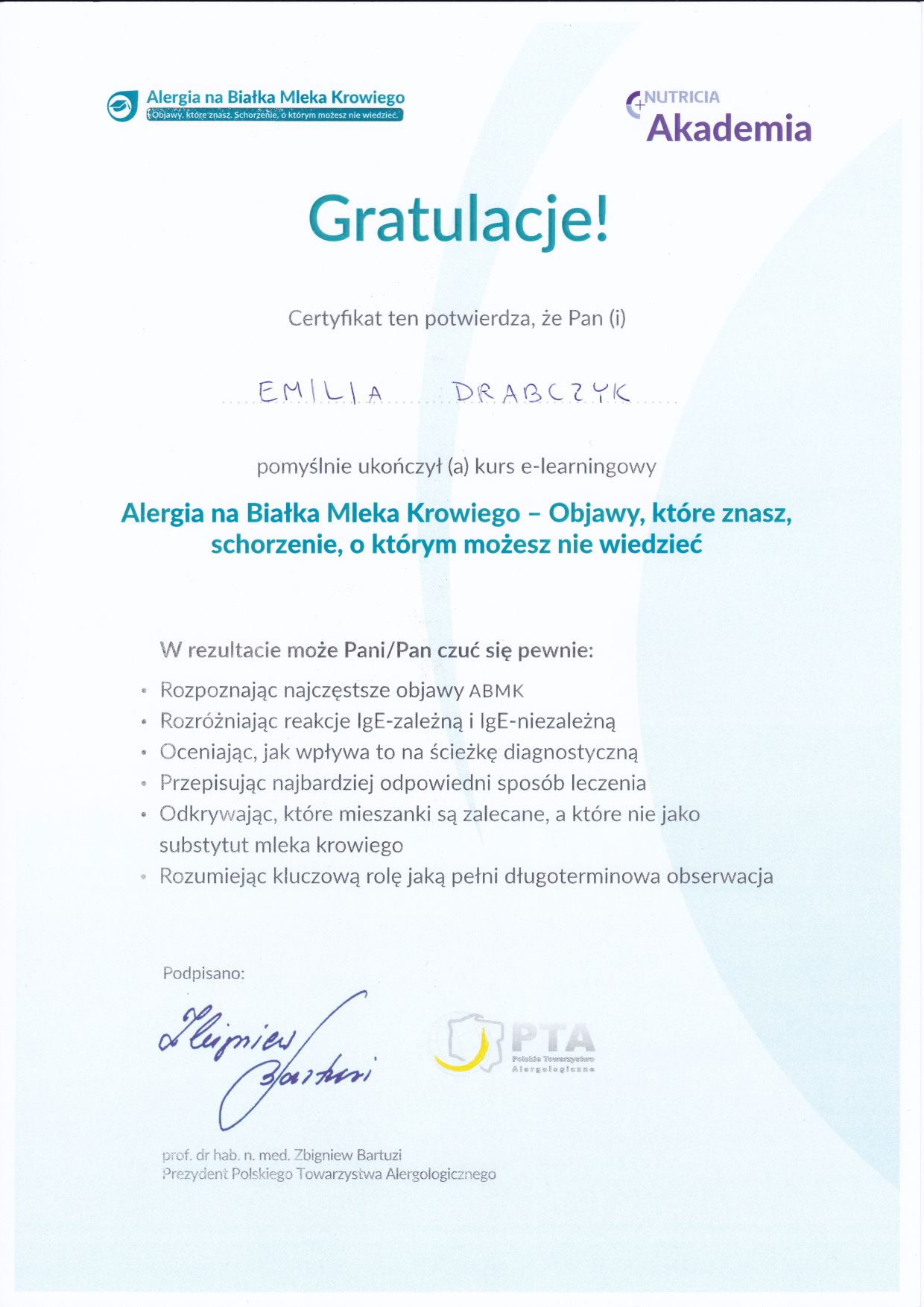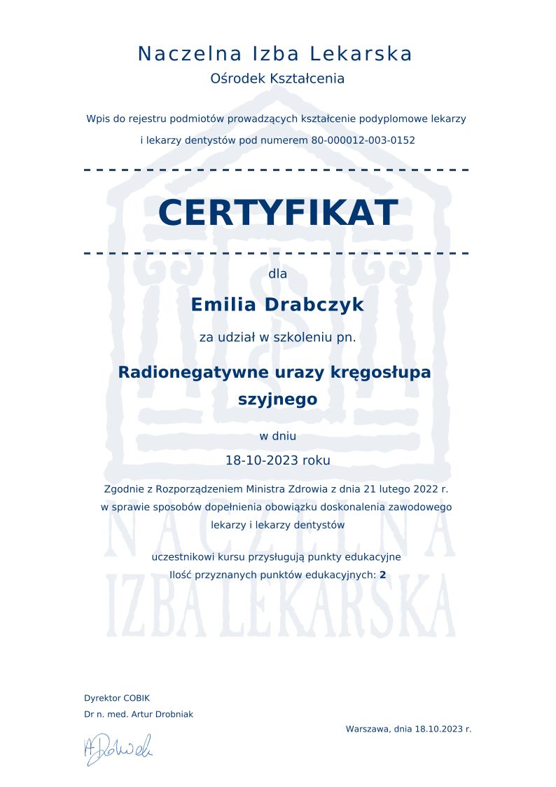 Medycyna uczy pokory, dlatego regularnie podnoszę swoje kwalifikacje uczestnicząc w wykładach, kursach, konferencjach i szkoleniach. Aby zapewnić najwyższe bezpieczeństwo swoim pacjentom oraz leczenie na wysokim poziomie, cały czas podnoszę swoje kompetencje i umiejętności zawodowe, często wykraczając poza ramy medycyny rodzinnej. Poniżej znajduje się galeria z certyfikatami z niektórych kursów.