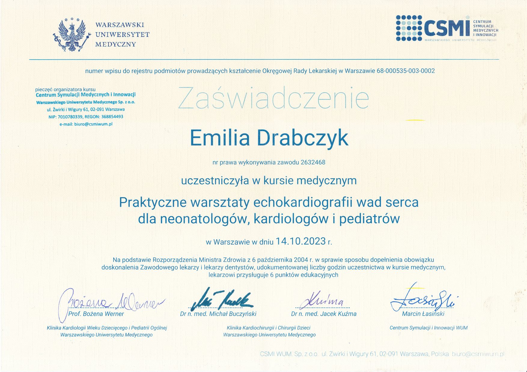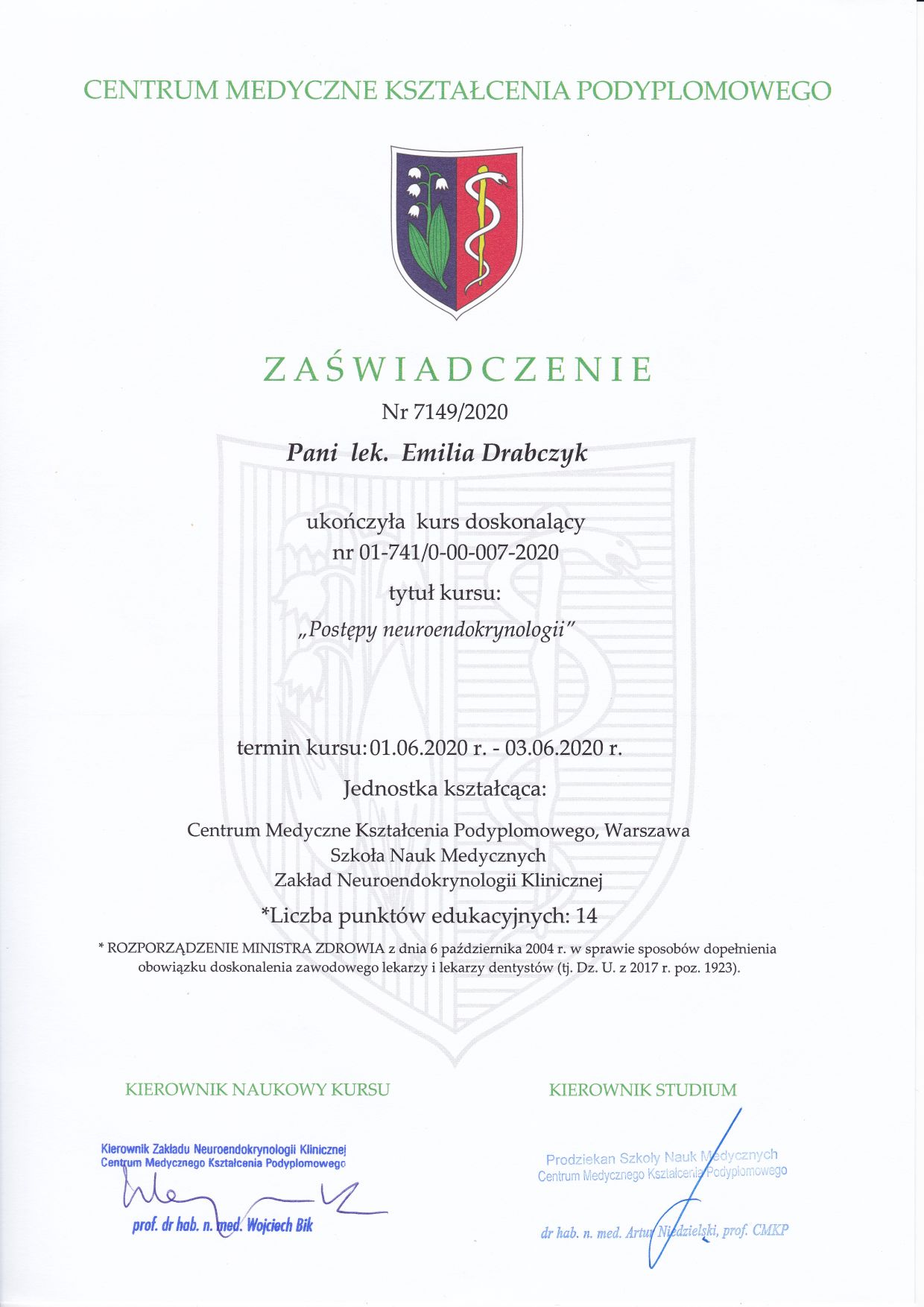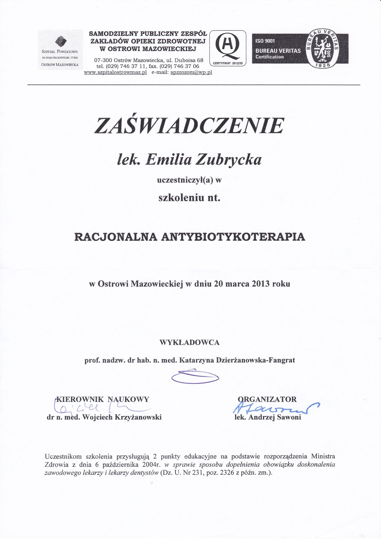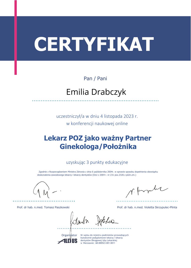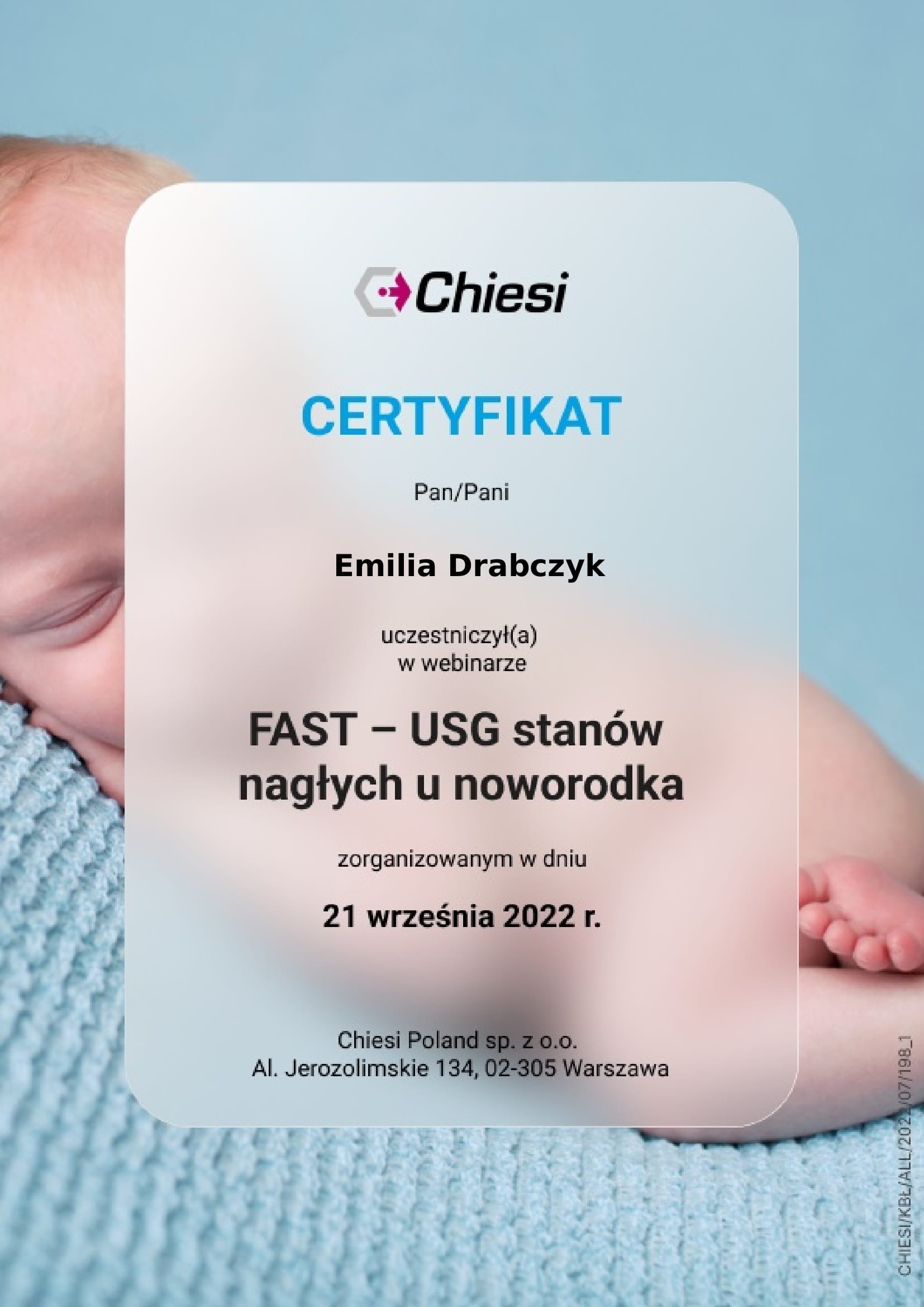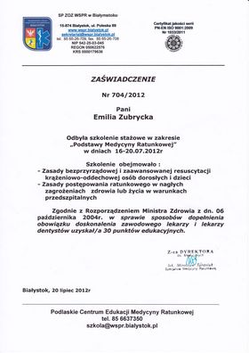 Medycyna uczy pokory, dlatego regularnie podnoszę swoje kwalifikacje uczestnicząc w wykładach, kursach, konferencjach i szkoleniach. Aby zapewnić najwyższe bezpieczeństwo swoim pacjentom oraz leczenie na wysokim poziomie, cały czas podnoszę swoje kompetencje i umiejętności zawodowe, często wykraczając poza ramy medycyny rodzinnej. Poniżej znajduje się galeria z certyfikatami z niektórych kursów.