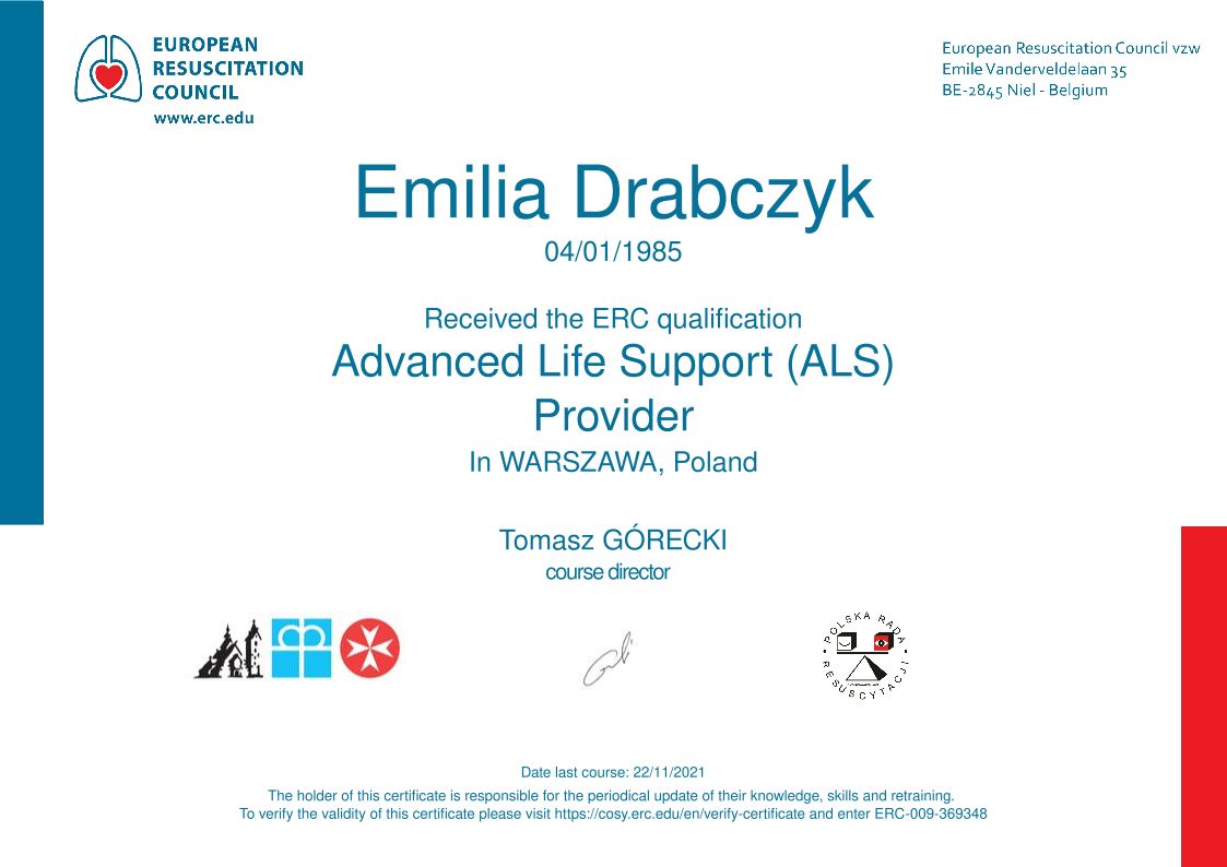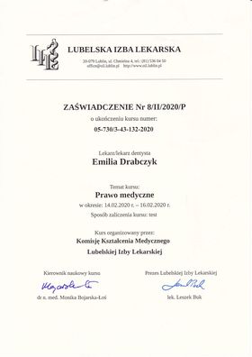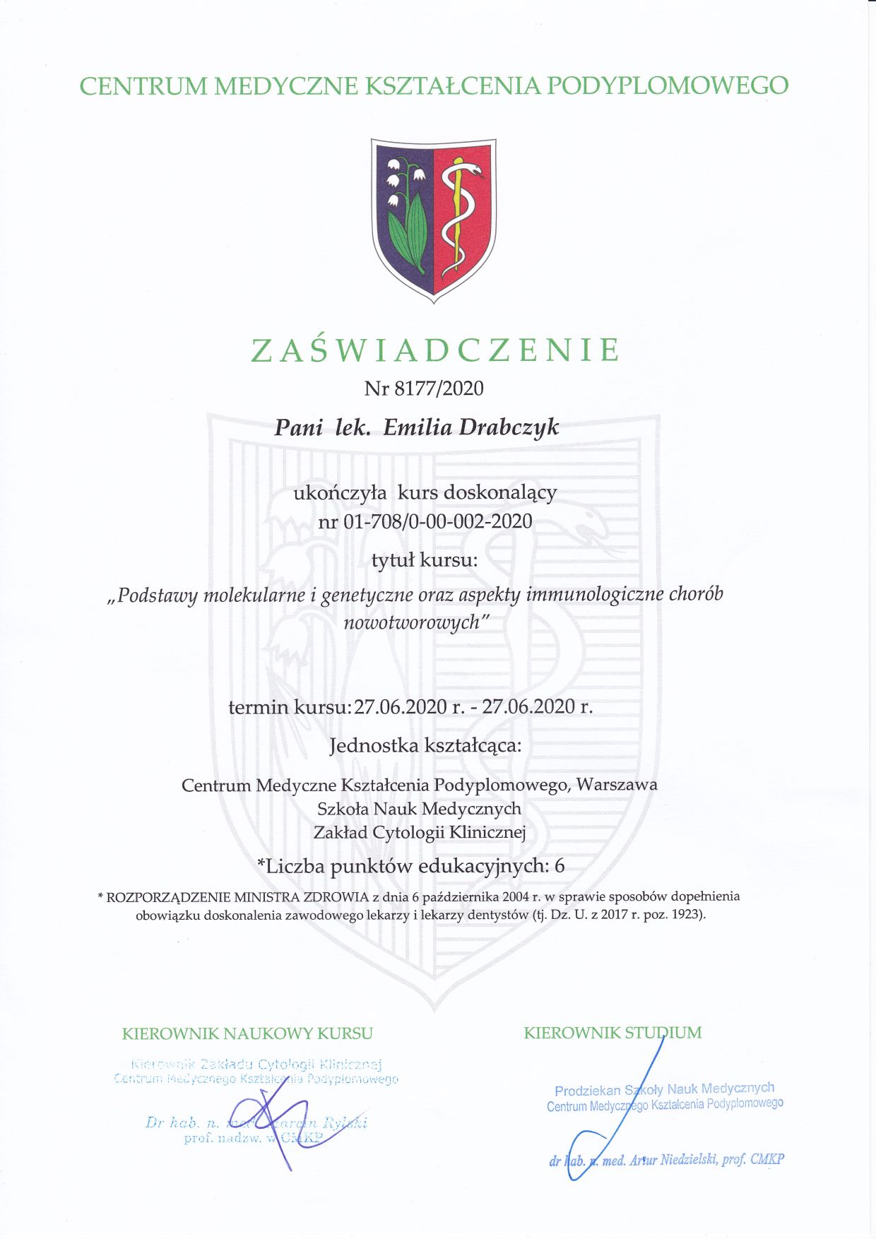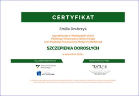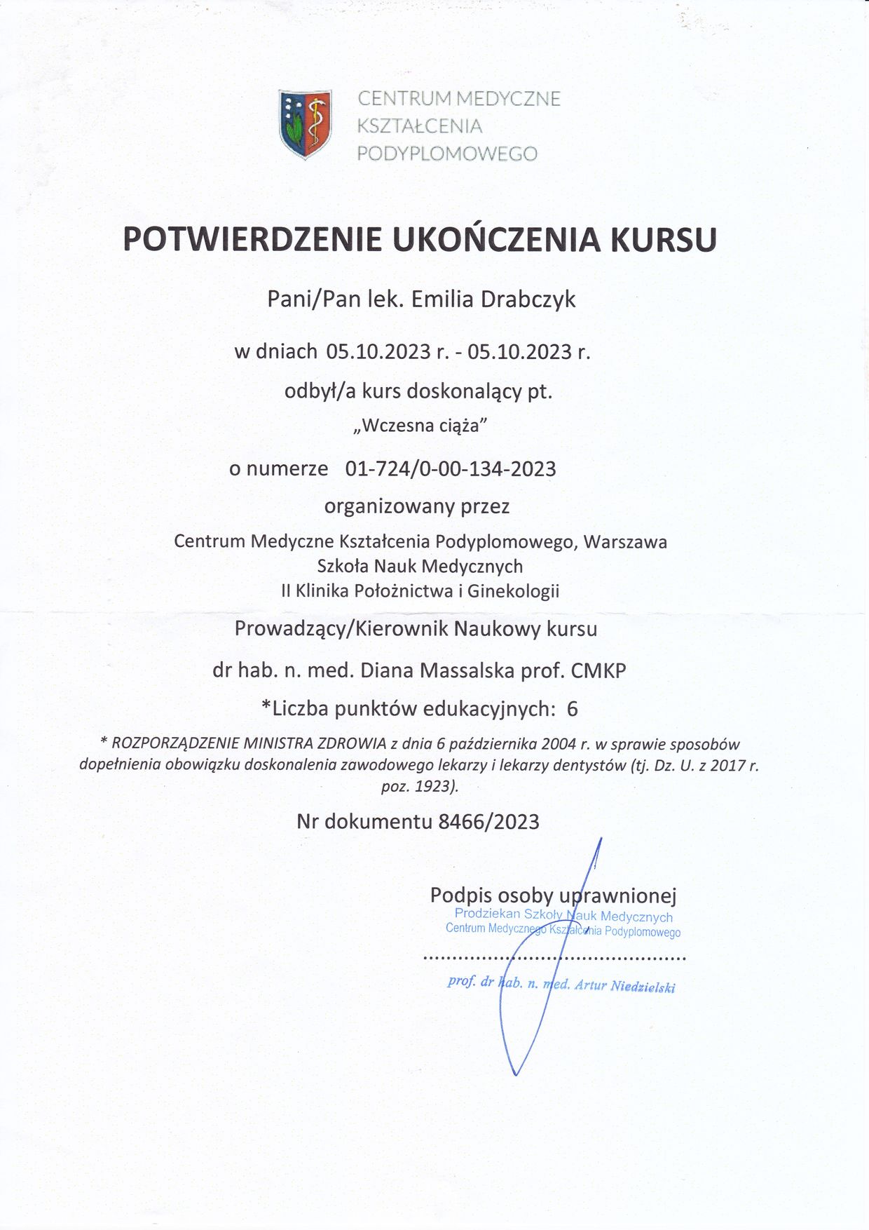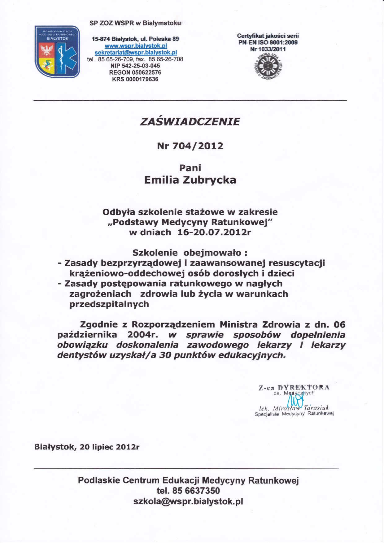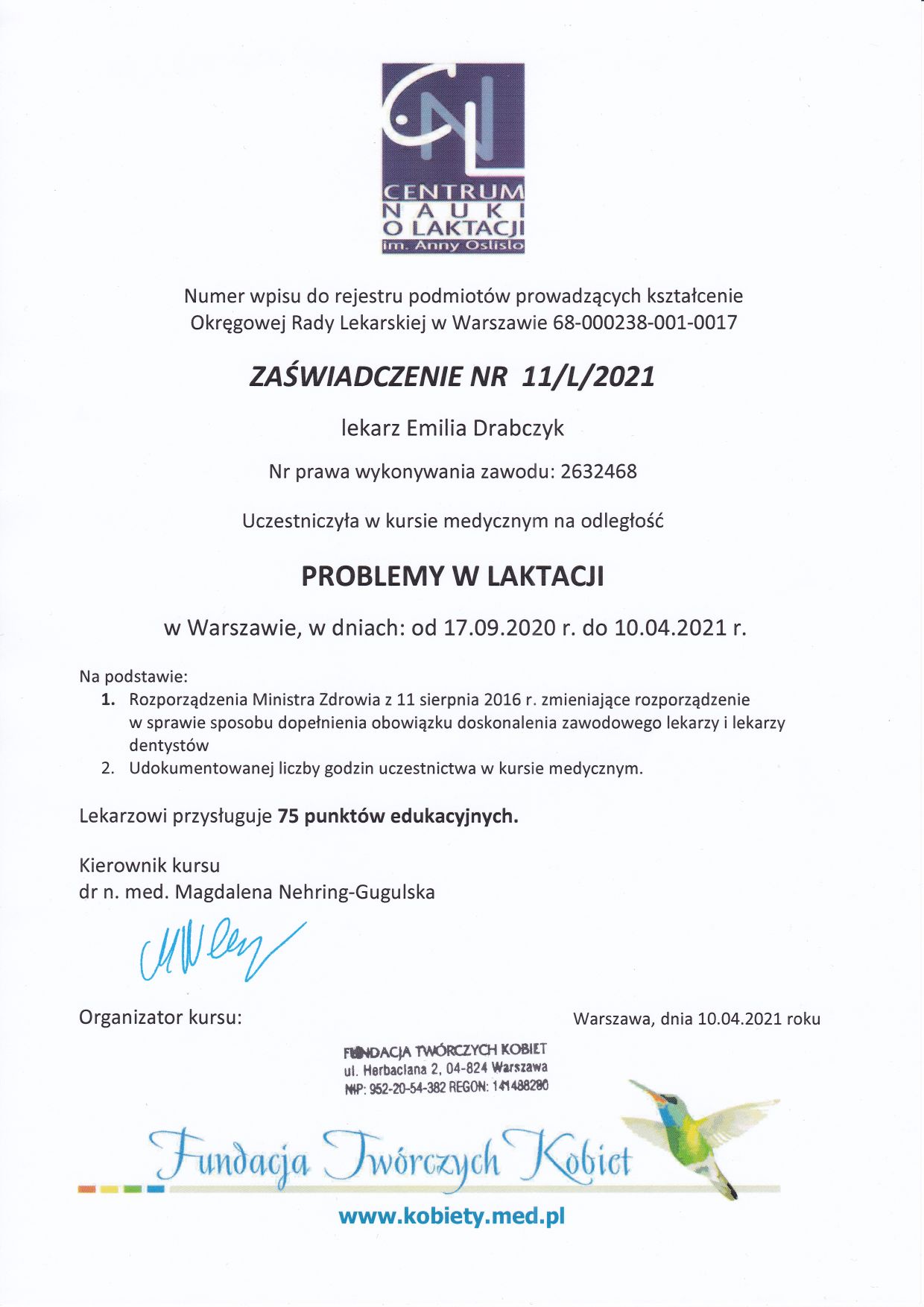 Medycyna uczy pokory, dlatego regularnie podnoszę swoje kwalifikacje uczestnicząc w wykładach, kursach, konferencjach i szkoleniach. Aby zapewnić najwyższe bezpieczeństwo swoim pacjentom oraz leczenie na wysokim poziomie, cały czas podnoszę swoje kompetencje i umiejętności zawodowe, często wykraczając poza ramy medycyny rodzinnej. Poniżej znajduje się galeria z certyfikatami z niektórych kursów.