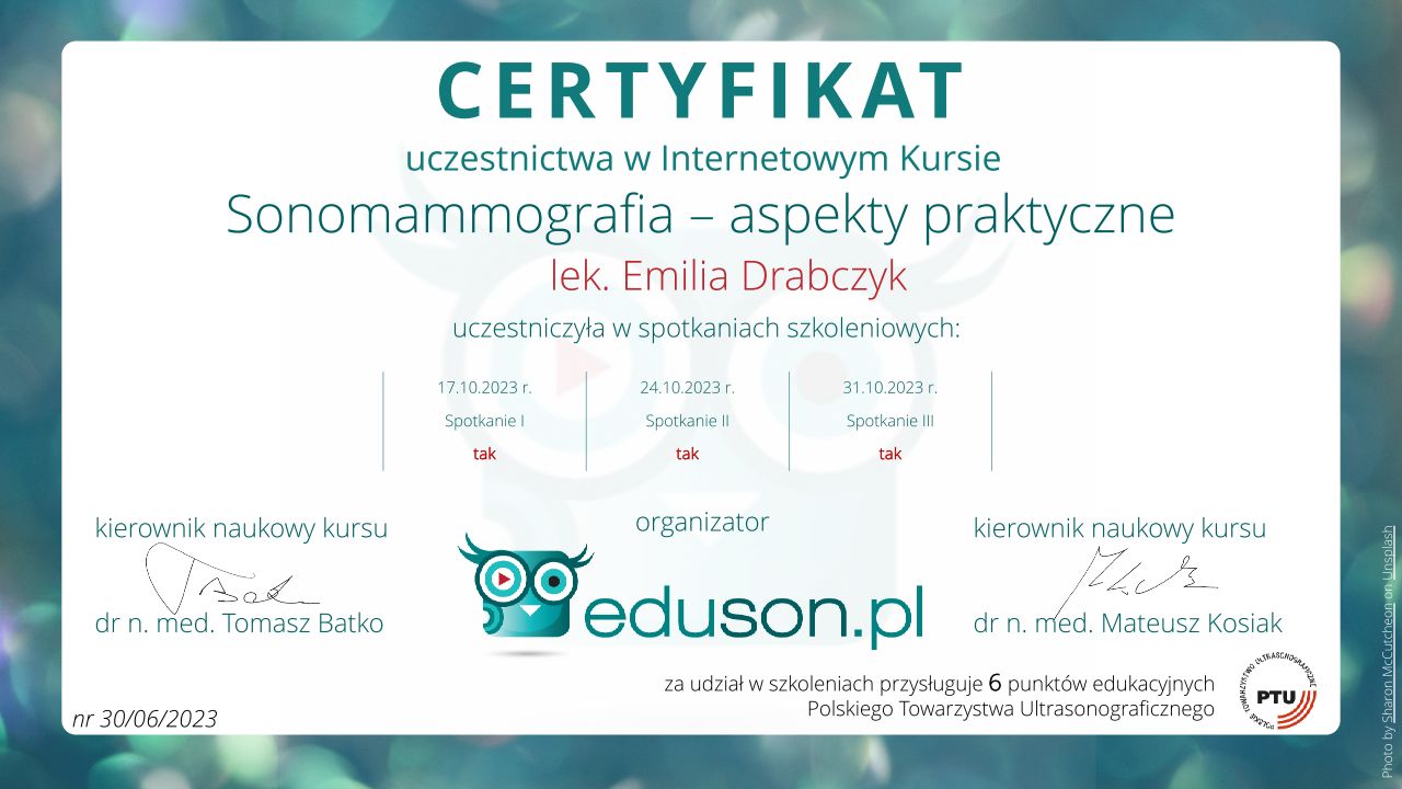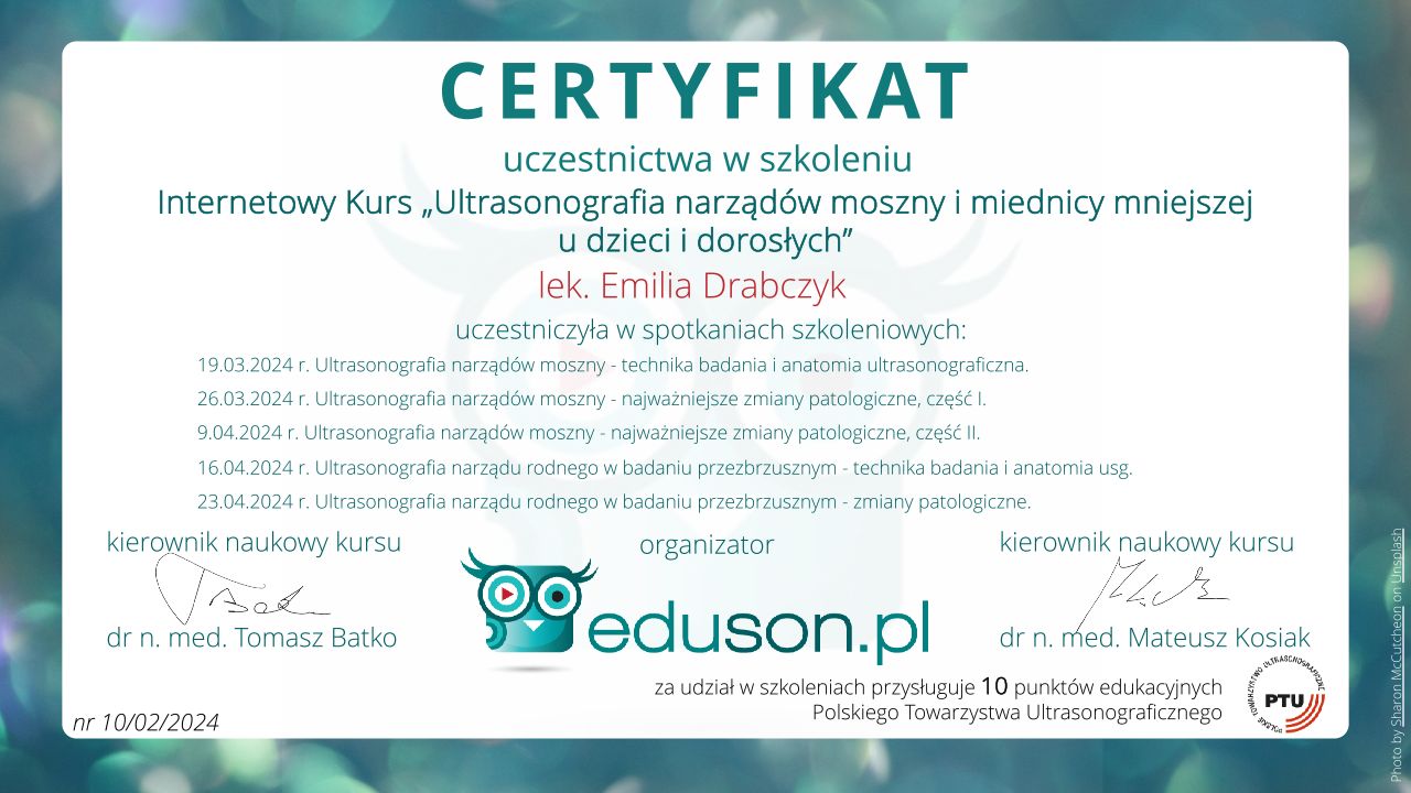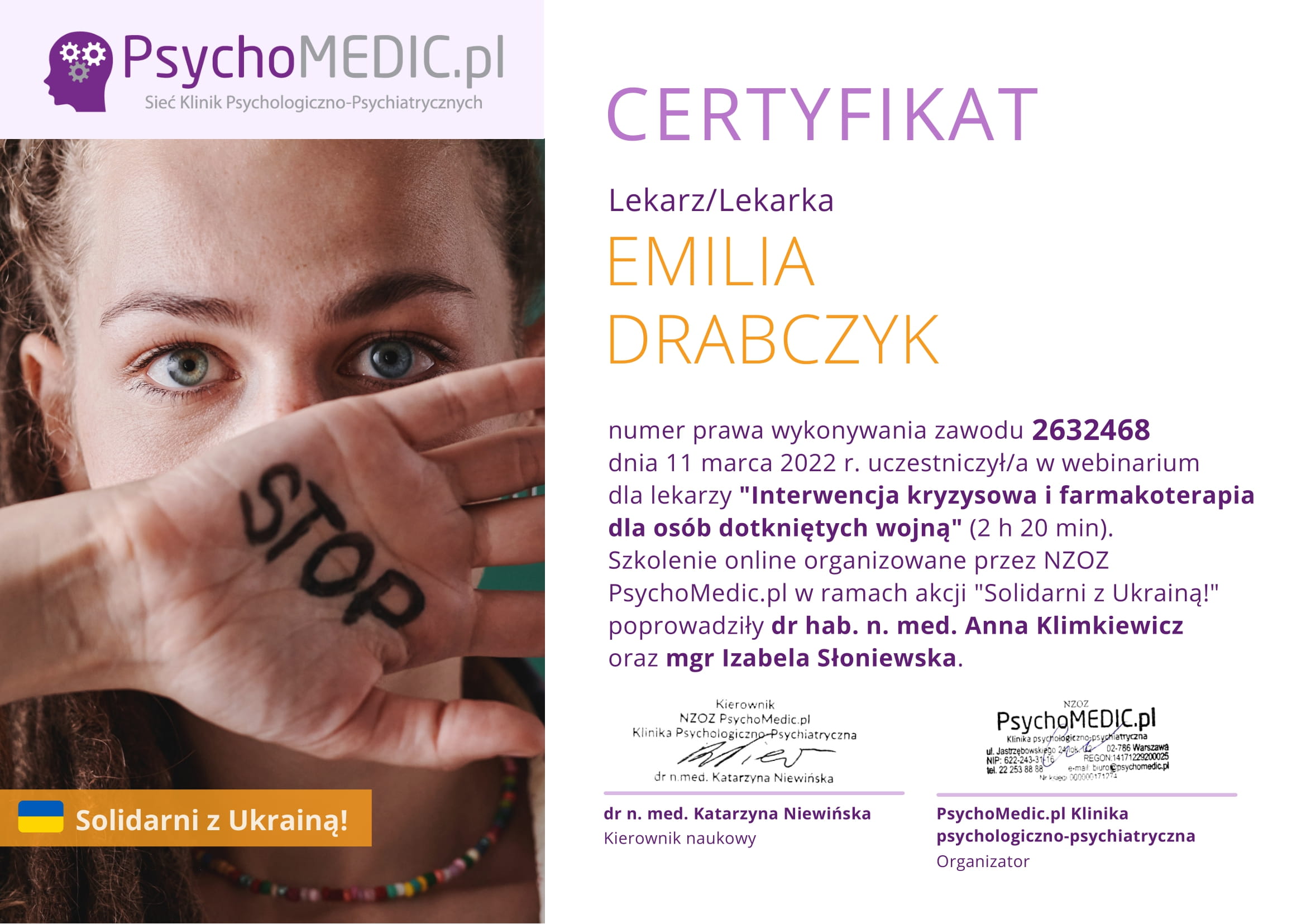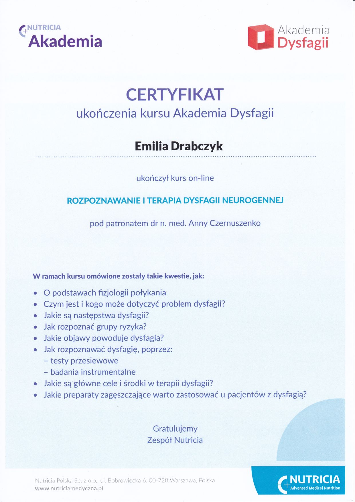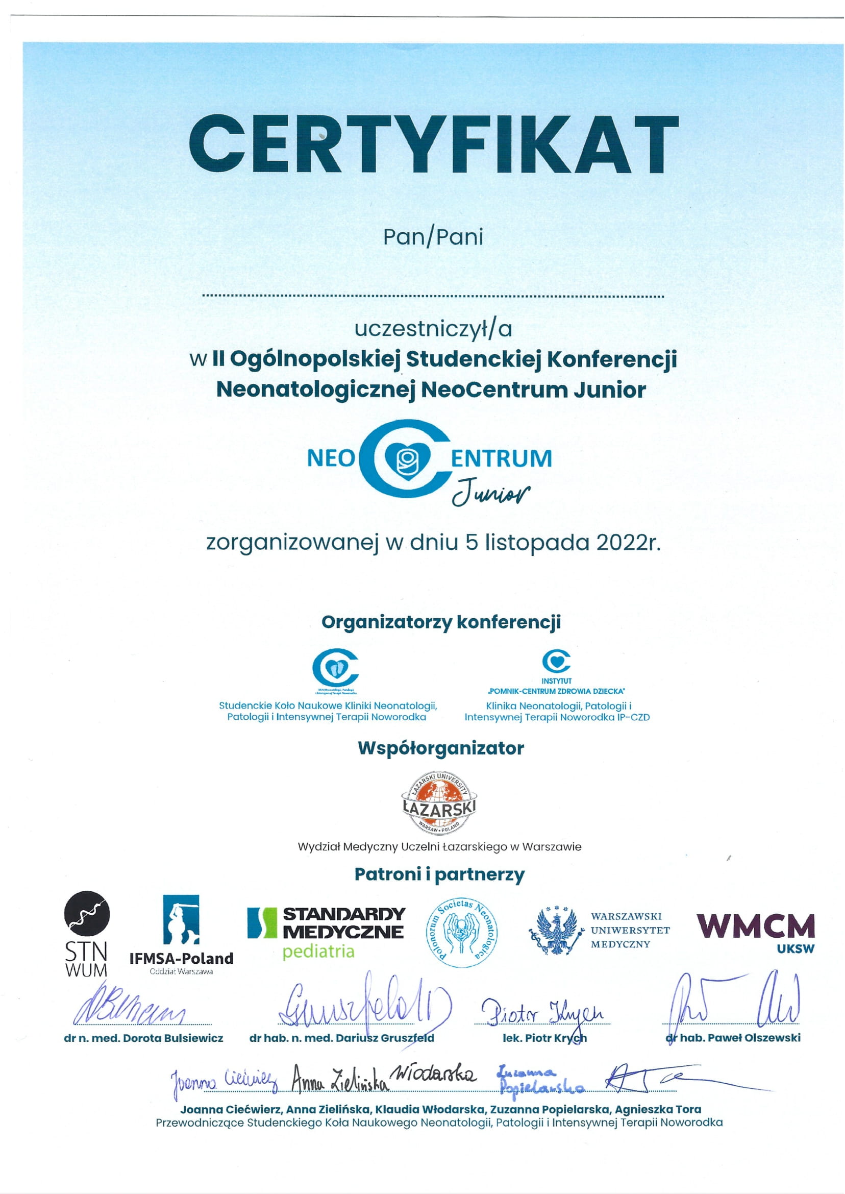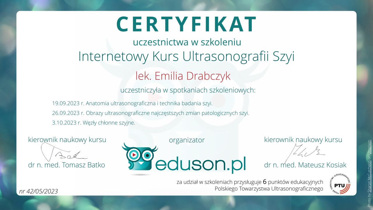 Medycyna uczy pokory, dlatego regularnie podnoszę swoje kwalifikacje uczestnicząc w wykładach, kursach, konferencjach i szkoleniach. Aby zapewnić najwyższe bezpieczeństwo swoim pacjentom oraz leczenie na wysokim poziomie, cały czas podnoszę swoje kompetencje i umiejętności zawodowe, często wykraczając poza ramy medycyny rodzinnej. Poniżej znajduje się galeria z certyfikatami z niektórych kursów.
